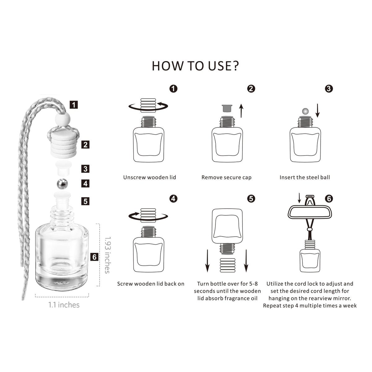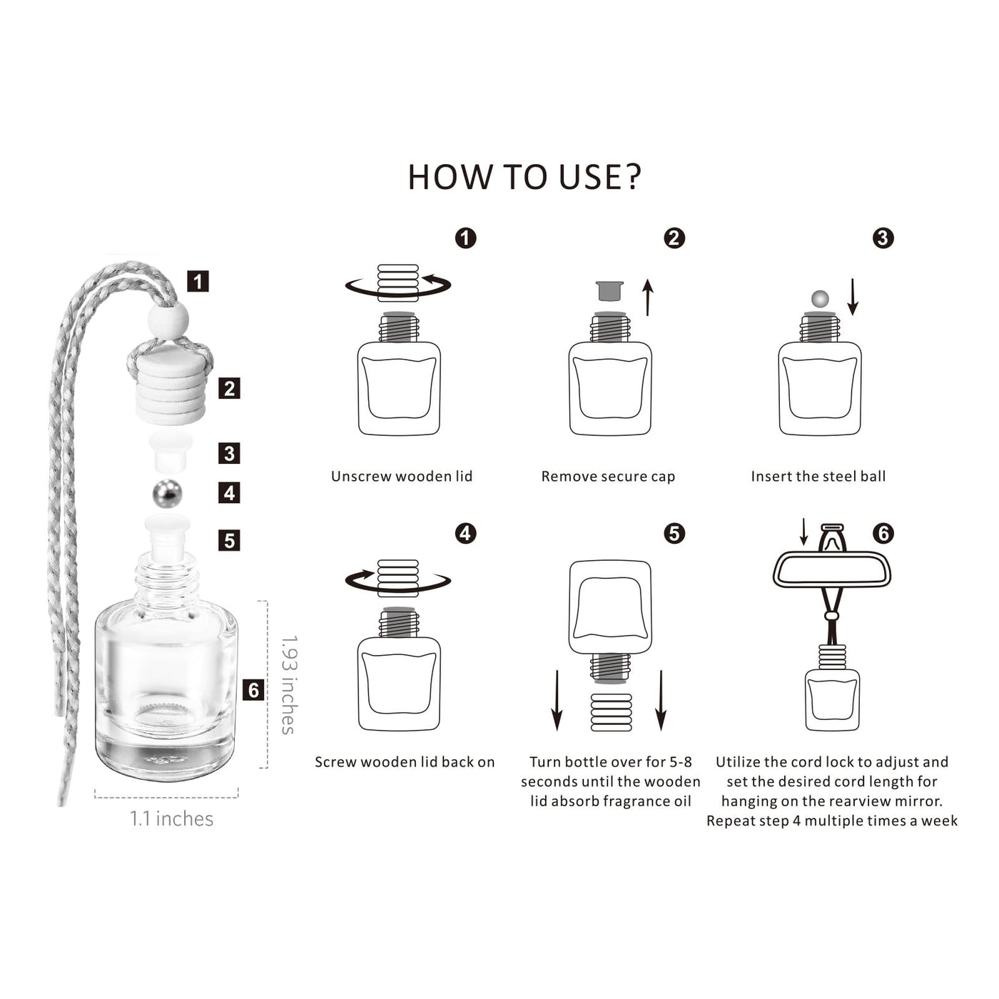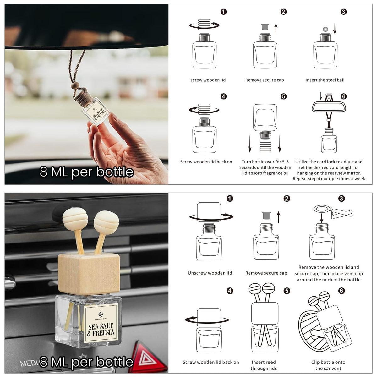 Two-pack car essential oil diffusers enhance your driving experience with delightful scents. Choose from over a dozen fragrances, ranging from subtle floral notes to rich woody aromas, ensuring there's a perfect match for your personality and mood. 2 pack car diffusers,16ml total (8ml each), Each bottle lasts for about 45 to 60 days, one hanging and one vent-mounted car air freshener, catering to various installation needs across different vehicle models.Many scents to choose from, launch a new scent every month.Below are the fragrance notes for our perfumes:Cherry Blossom:Top: creamy peach, orange blossom Middle: jasmine, clove, heliotropeBase: sugary vanilla, tonka bean, amber, woody, white muskMoonlight Vanilla:Top: anise, lemon, tarragonMiddle: floral (lily of the valley, heliotrope, geranium), cloveBase: musk, patchouli, tonka bean, cedarwoodPink Champagne:Top: citrus, apple, raspberryMiddle: rose, freesiaBase: woody, vanilla, amber, muskSea Salt & Freesia:Top: limey, cyclamen, magnolia, lily of the valleyMiddle: magnolia, lily of the valley, marine, lilyBase: muskBay Rum:Top: anise, lemon, tarragonMiddle: floral (lily of the valley, heliotrope, geranium), cloveBase: musk, patchouli, tonka bean, cedarwoodRose:Top: Fresh floralMiddle: RoseBase: Powder, vanillaHoney Bourbon:Top: alcohol accord, citrus (orange)Middle: herbal, floral (rose, heliotrope)Base: bourbon barrel accord, woody (patchouli), muskLondon Man:Top: marine, green (violet), citrus (bergamot, orange)Middle: herbal, floral (lily, freesia, jasmine)Base: woody (cedar, patchouli), amber, musk