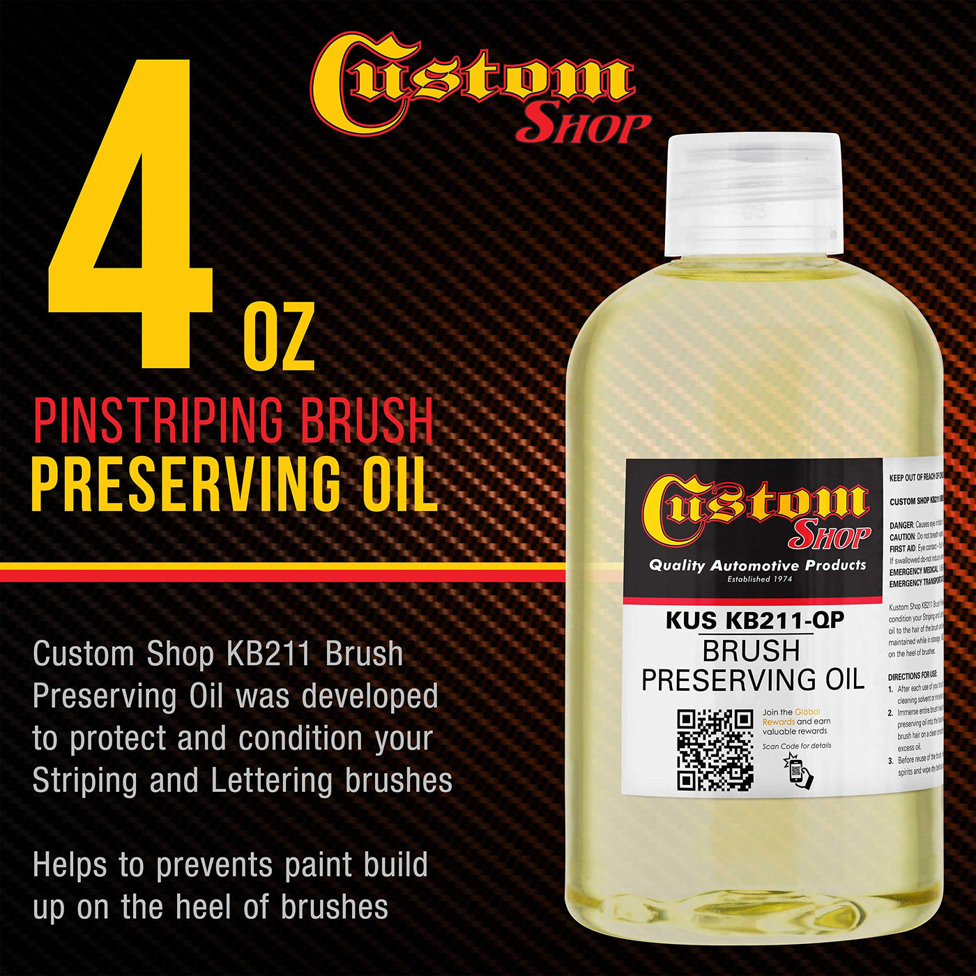 Pamper Your Brushes and They'll Work Hard for You! Kustom Shop KB211 Brush Preserving Oil was developed to protect and condition your Striping and Lettering brushes, KB211 restores the natural oil to the hair of the brush and keeps brushes soft and allows shape to be maintained while in storage. KB211 also helps to prevents paint build up on the heel of brushes. Brush Preserving Oil is available in convenient four ounce Bottles.