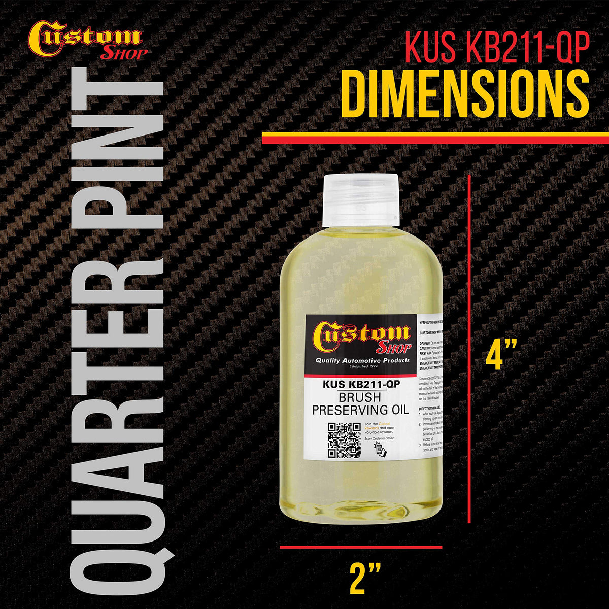 Q: What size is the bottle of KB211 Brush Preserving Oil?A: Kustom Shop KB211 Brush Preserving Oil is available in a convenient four-ounce bottle, making it easy to store and use as needed.