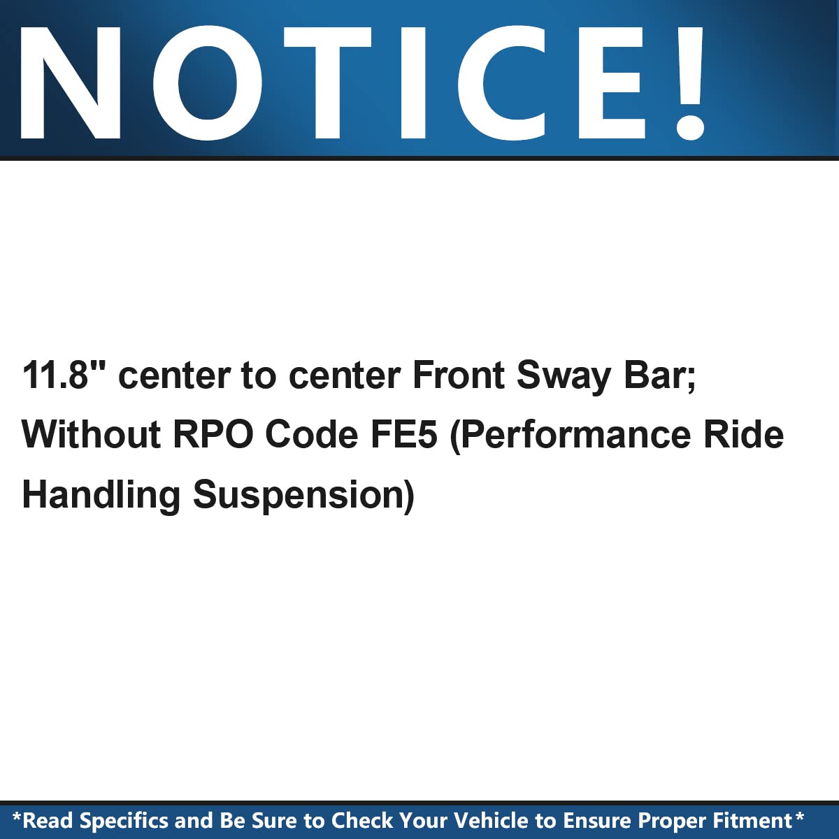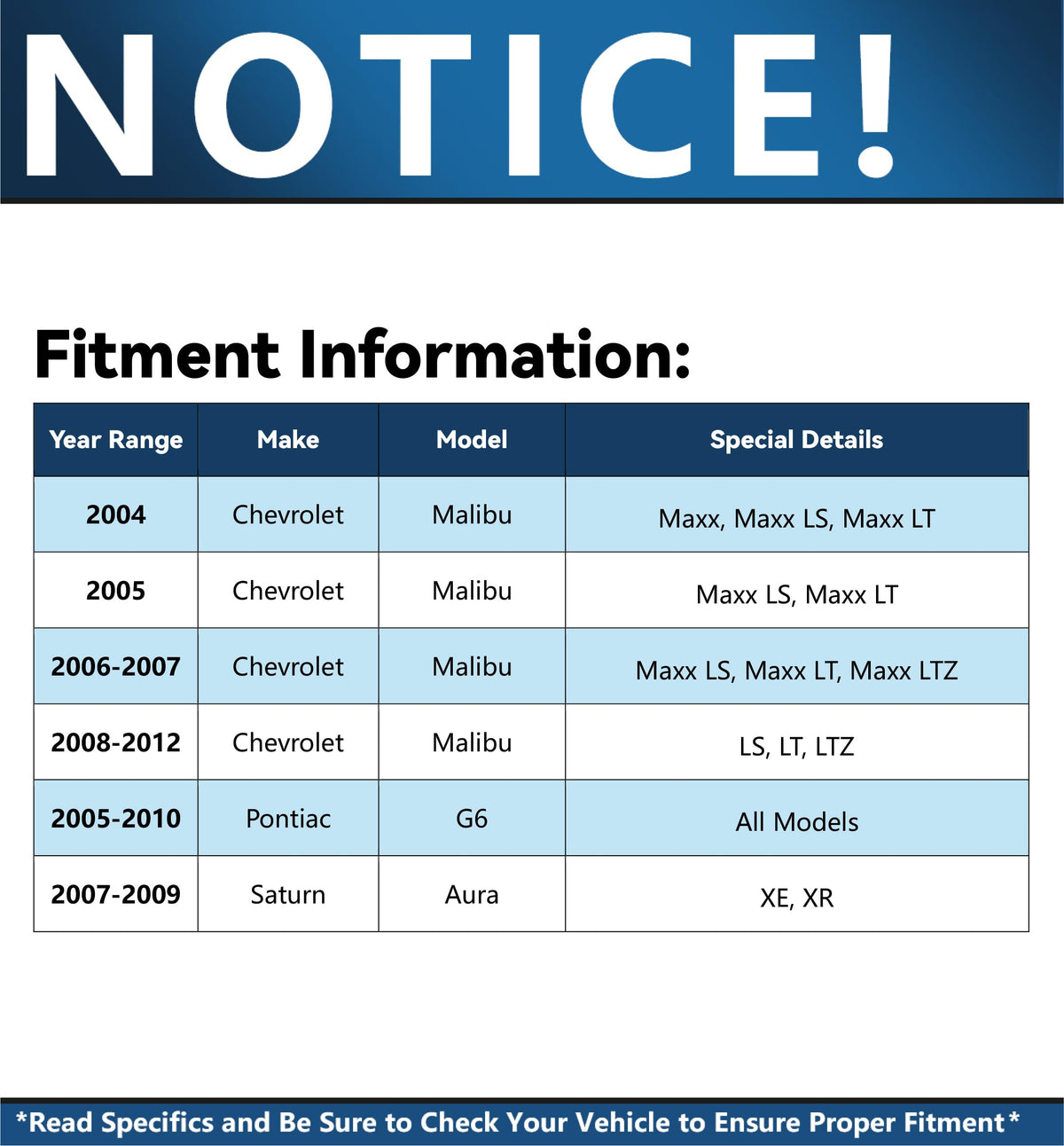 Kit Includes: 1x Front Quick Install Ready Strut Assembly (Driver) - 172200 1x Front Quick Install Ready Strut Assembly (Passenger) - 172199 2x Rear Shock Absorber - 349008 [4349008] 2x Front Stabilizer / Sway Bar End Link (11.8'' From Center-to-Center Version) - K80252 2x Rear Stabilizer / Sway Bar End Link - K80851 Fitment: 11.8'' center to center Front Sway Bar; without RPO Code FE5 (Performance Ride Handling Suspension) Replacement for 2004 Chevrolet Malibu (Maxx, Maxx LS, Maxx LT) Replacement for 2005 Chevrolet Malibu (Maxx LS, Maxx LT) Replacement for 2006-2007 Chevrolet Malibu (Maxx LS, Maxx LT, Maxx LTZ) Replacement for 2008-2012 Chevrolet Malibu (LS, LT, LTZ) Replacement for 2005-2010 Pontiac G6 Replacement for 2007-2009 Saturn Aura (XE, XR) Introduction: Detroit Axle is a leading global retailer and distributor of OE re-manufactured and new aftermarket auto parts. We are committed to providing first-class products and outstanding customer service at an incredible value. Our rapidly-expanding product line includes CV Axles, Wheel Hub & Bearings, Suspension & Chassis parts, Complete Strut Assemblies, Shock Absorbers, Drilled & Slotted Brake Rotors, Conventional Brake Rotors, Ceramic Brake Pads, Rack & Pinion Assemblies, Gearboxes, Drive Shafts, Transmissions, and more.