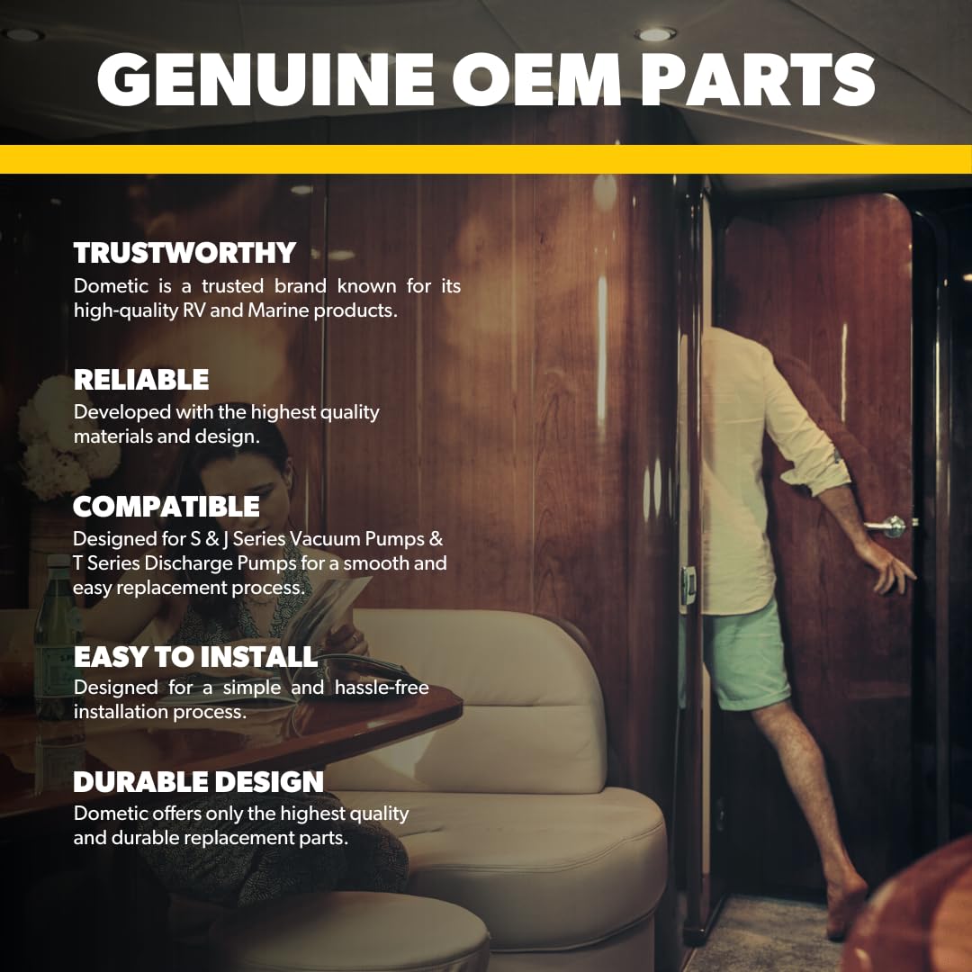 Q: Is the Dometic 385230980 Toilet Bellows Pump an OEM part?A: Yes, the Dometic 385230980 Toilet Bellows Pump is a genuine OEM part, guaranteeing high-quality performance and reliability, with spare parts designed for long-lasting use in your toilet system.