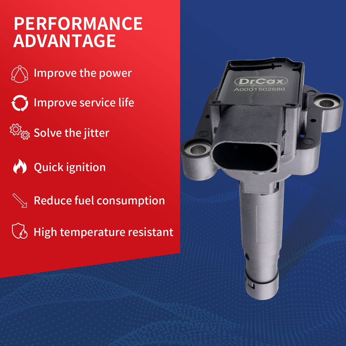 ALL ITEMS ARE BRAND NEW Package Including: 1 x New Ignition Coil Common Symptoms of a Faulty Coil Pack: A rough idle A noticeable lack of power An unexplainably louder-than-usual engine A significant drop in RPMs while accelerating for no apparent reason A blinking or intermittently activating check engine light An active gas warning light when the vehicle has plenty of gasoline Smoke from the exhaust emitting intermittently, instead of in a steady stream If your car has the above symptoms, it is highly recommended to replace the ignition coil in time for your driving safety. Why Choose Our Coils? 100% Factory tested Ready to use, Direct Replacement Built to strict quality control standards Use highest grade material with OE+ durability Durable and reliable under extreme conditions while Provide high Electrical, Corrosion, and Abrasion Resistance Part Numbers: 0001502580, A000 150 25 80, GN10552, UF658 IC761 E1158 C931 Applications and Compatability Compatible with Mercedes-Benz SLK250 2012-2015 Compatible with Mercedes-Benz C250 Turbo 2012-2015 Compatible with Mercedes-Benz C250 2014-2015 About Us DrCax are automotive-related brand,supplying mainly high quality auto parts for all over the world.Experienced in OEM service and Tuning parts for years.