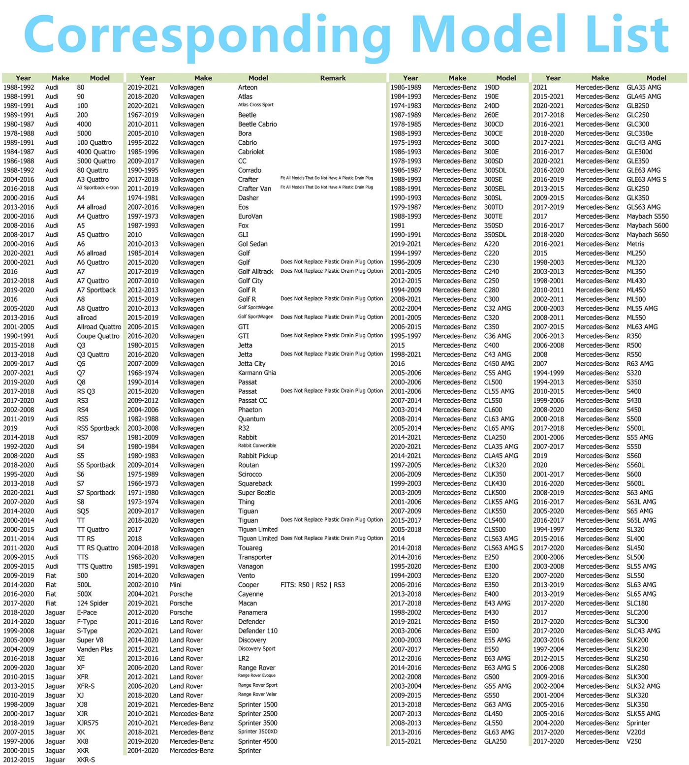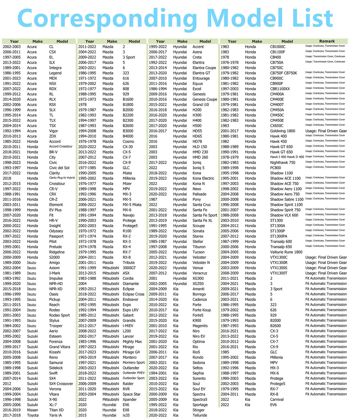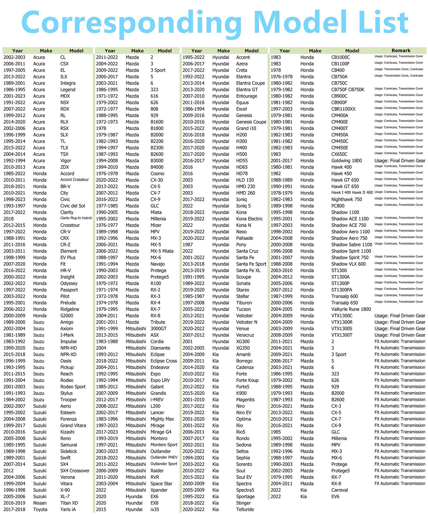 - Q: What vehicles are compatible with the Dsnaduo M14x1.5MM Stainless Steel Magnetic Oil Drain Plug? A: The Dsnaduo M14x1.5MM Magnetic Oil Drain Plug is compatible with a wide range of vehicles including Honda Accord, Civic, CR-V, and Odyssey, as well as Acura, Ford, GM, Mazda, Hyundai, KIA, Audi, RAM, Yamaha, and many others. Check the detailed model list provided in the product description to ensure compatibility.