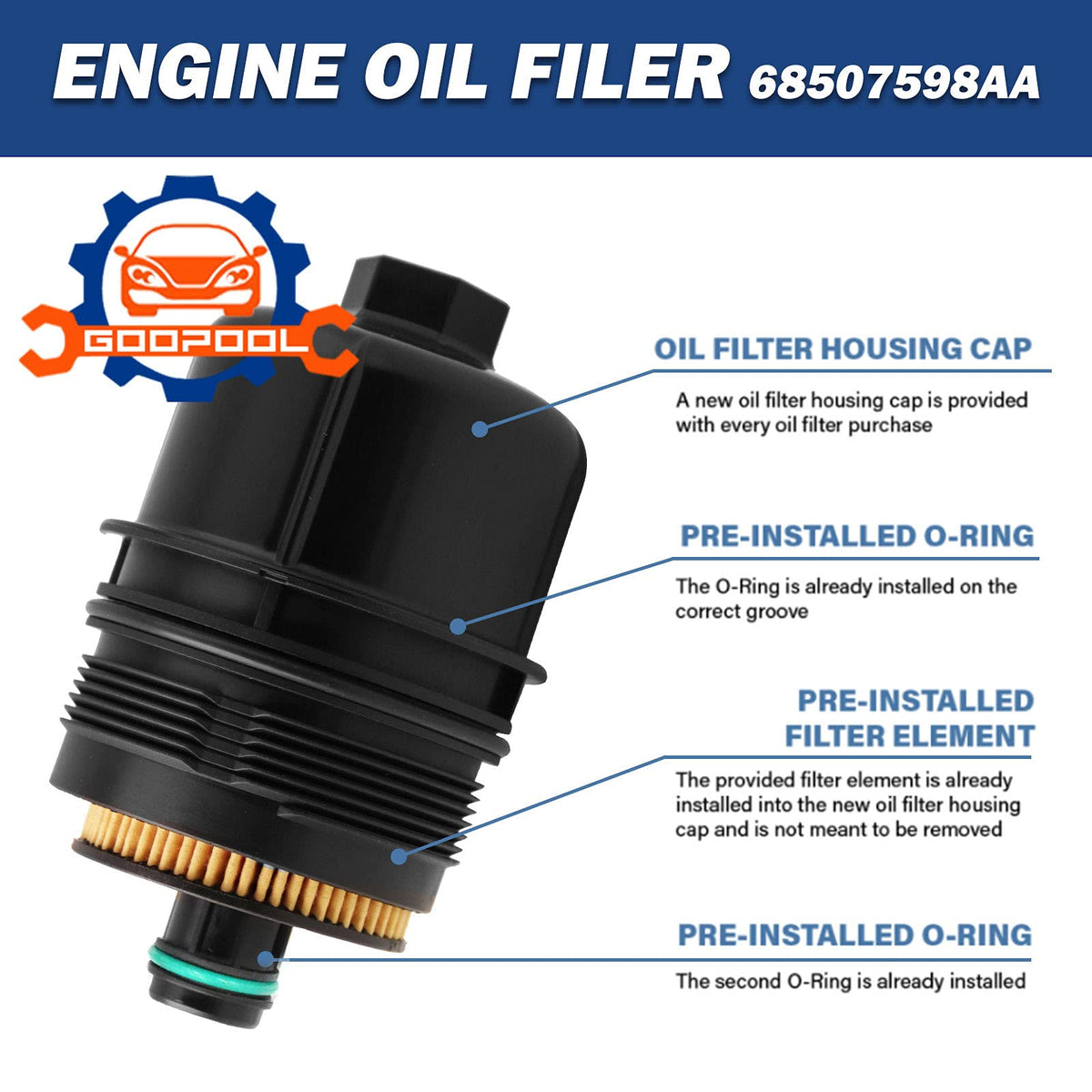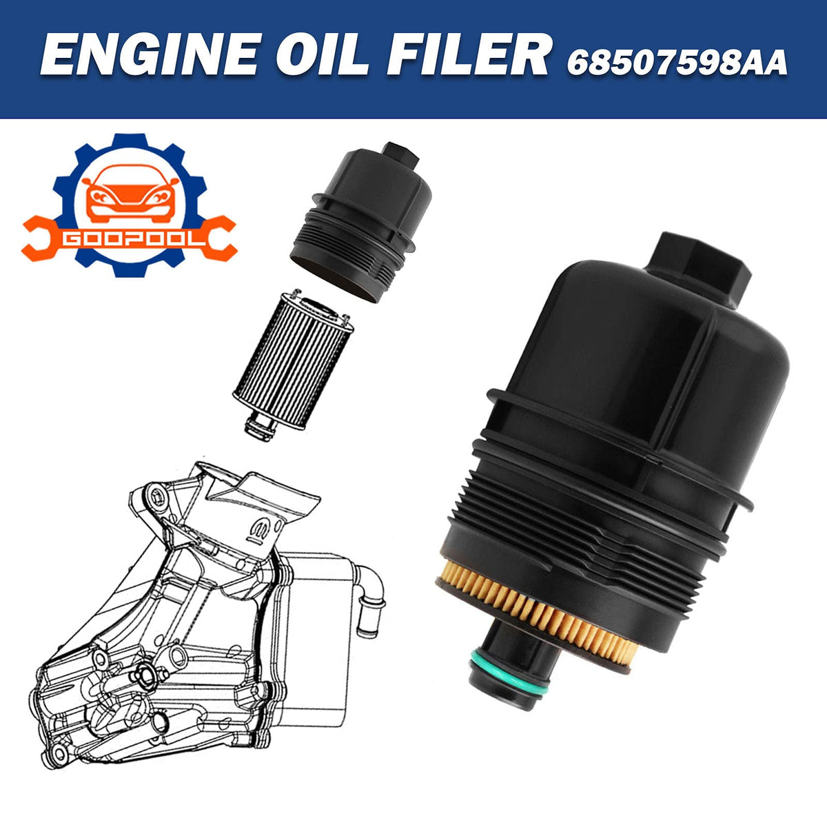 Q: How do I replace the engine oil filter using this product?A: To replace the engine oil filter, locate the filter on top or on the side of the engine. Remove the old filter and cap, then install the new Ecodiesel Engine Oil Filter 68507598AA and its cap. Ensure both are securely fitted to prevent oil leaks.