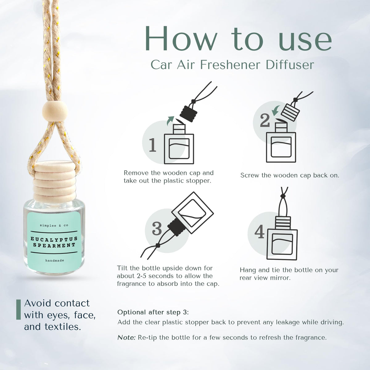Q: Is this car air diffuser easy to install and use?A: Yes, the Eucalyptus & Spearmint Car Air Freshener Diffuser is designed for easy use. You can tie the custom band to your car's rearview mirror or any other convenient location.