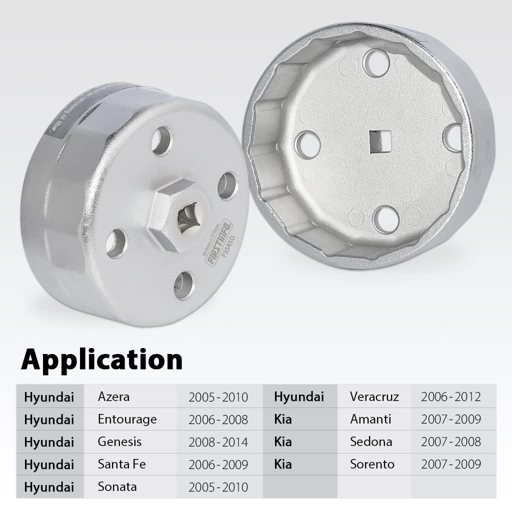 Q: What vehicles is the FIRSTINFO 3/8" Drive Oil Filter Wrench compatible with?A: The FIRSTINFO 3/8" Drive Oil Filter Wrench is compatible with various Hyundai and Kia models, including Kia Amanti, Sedona, Sorento, and Hyundai Azera, Entourage, Genesis, Sonata, and Veracruz.