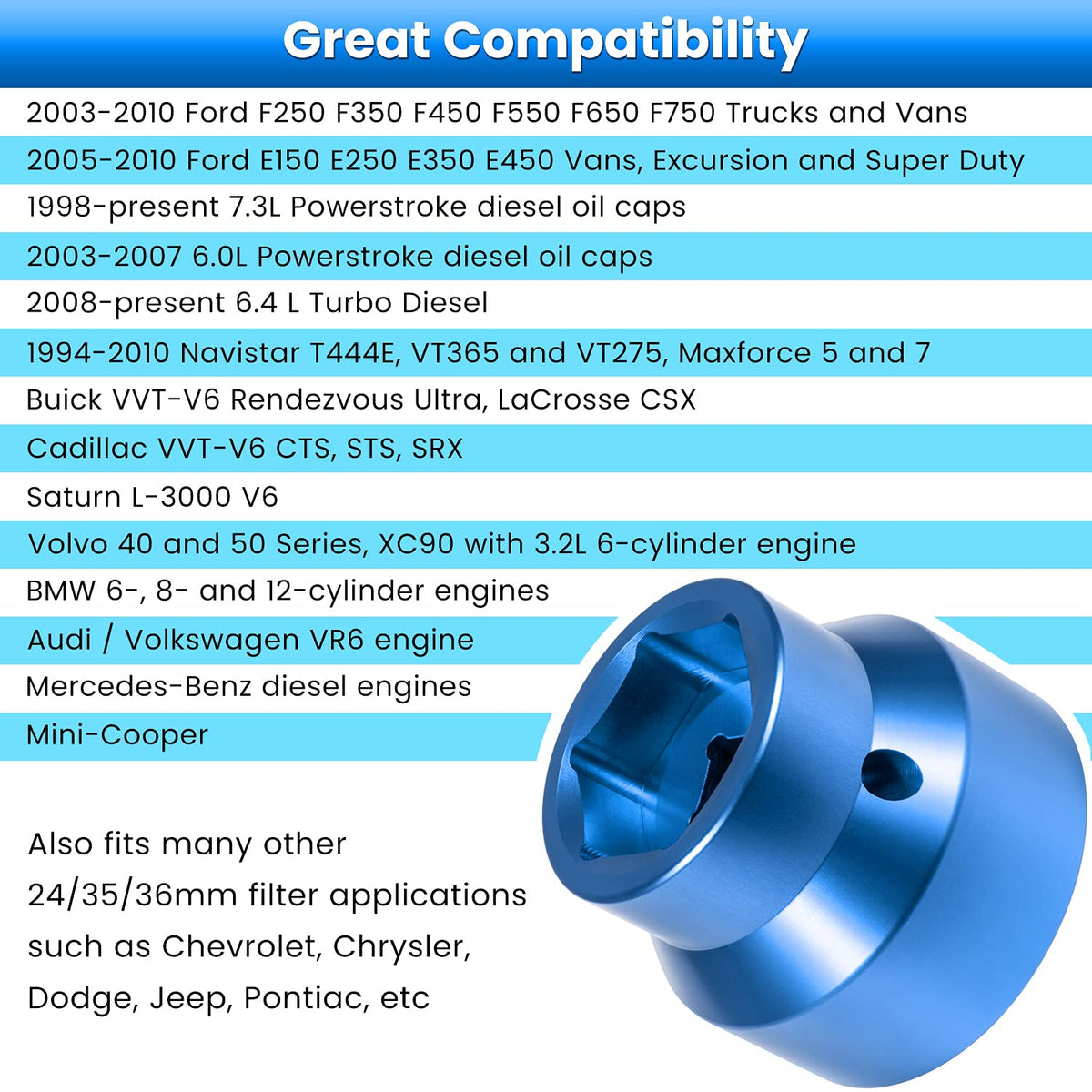 Q: Is this fuel filter socket compatible with my Ford truck?A: Yes, this fuel filter/oil filter socket is compatible with a range of Ford models, including the 2003-2010 Ford F250, F350, F450, F550, F650, and F750, as well as the 2005-2010 Ford E150, E250, E350, E450 Vans, Excursion, and Super Duty.
