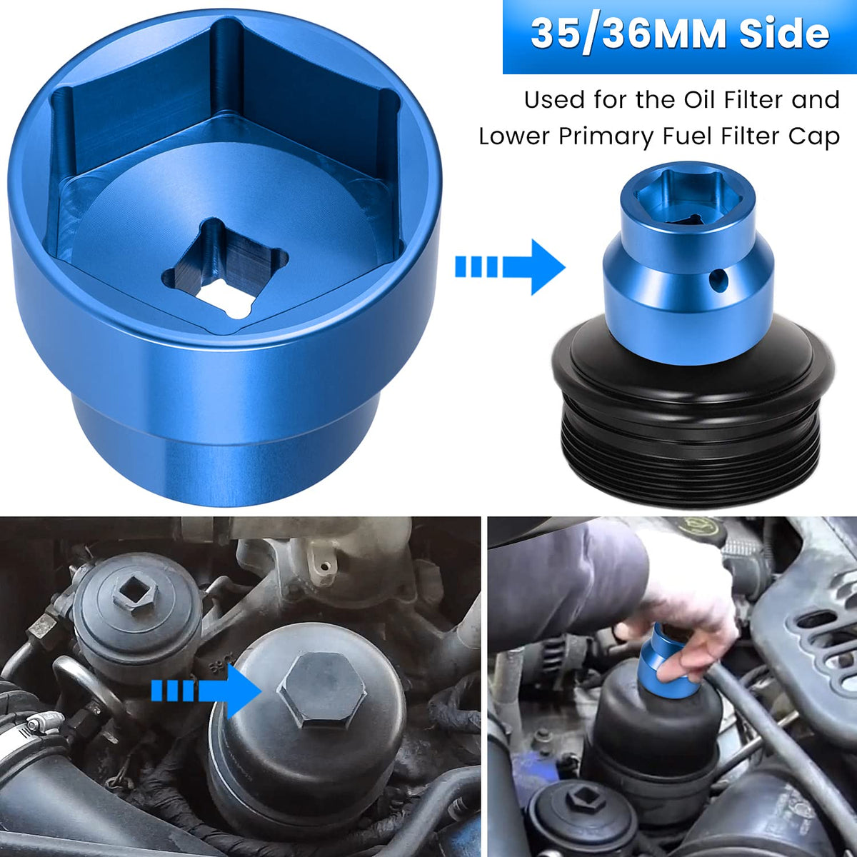 Fuel Filter/Oil Filter Socket 24Mm / 36Mm Reversible Fuel Filter Cap Remover And Installer Assistant For 2003-2010 6.0L / 6.4L Ford Powerstroke Diesel (Blue)