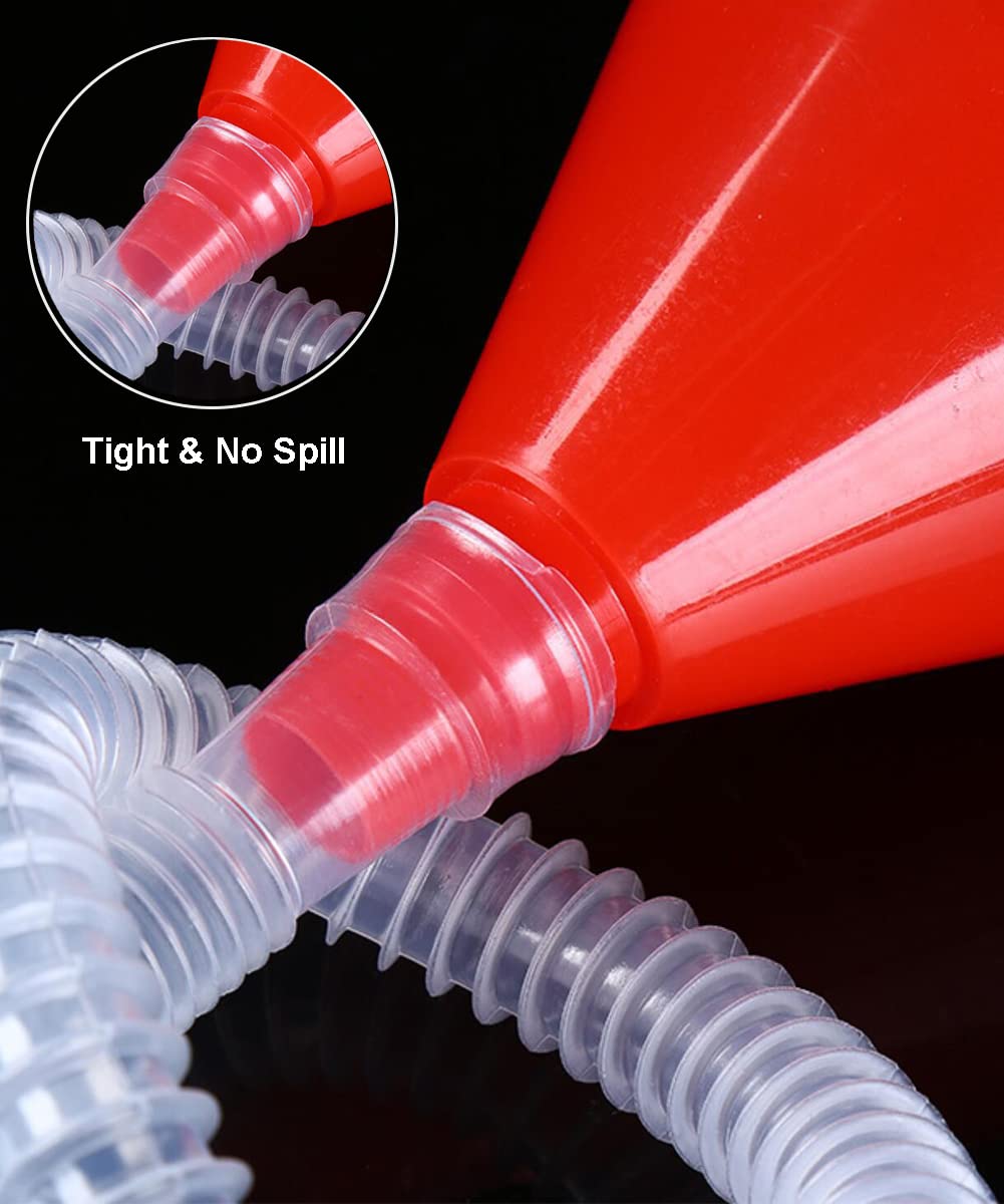 Q: How do I prevent spills while using the funnel?A: The funnel features a threaded connection between the funnel and the flexible tube, which helps to prevent spills and ensures that impurities do not enter the fuel, maintaining the purity of the liquid being transferred.