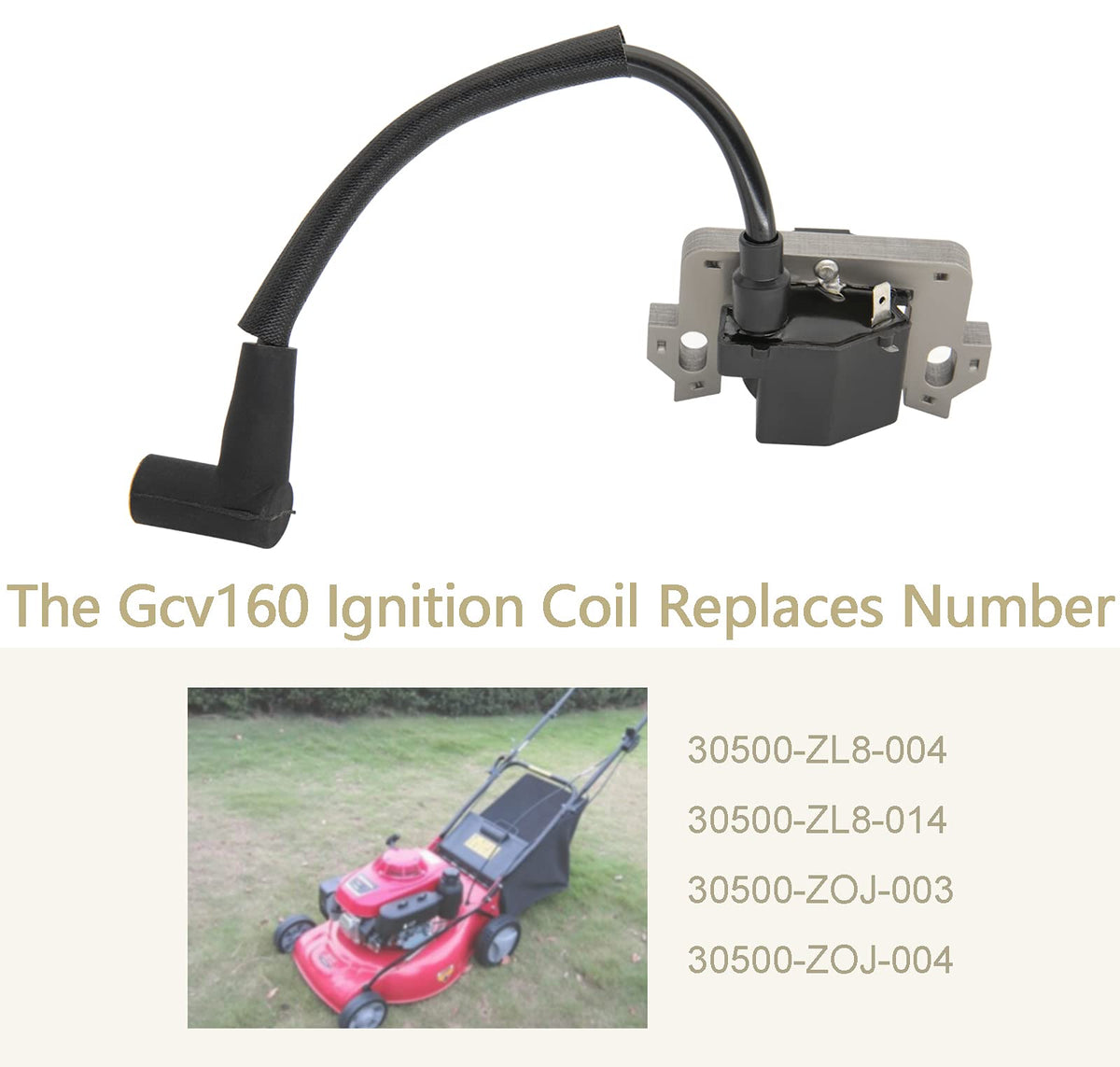 Q: How do I know if the GCV160 Ignition Coil is suitable for my lawn mower?A: To determine if the GCV160 Ignition Coil is suitable for your lawn mower, check the part numbers. This coil replaces 30500-ZL8-004, 30500-ZL8-014, 30500-ZOJ-003, and 30500-ZOJ-004. Additionally, it fits models like HRB216, HRR216, HRS216, HRX217, and many more.