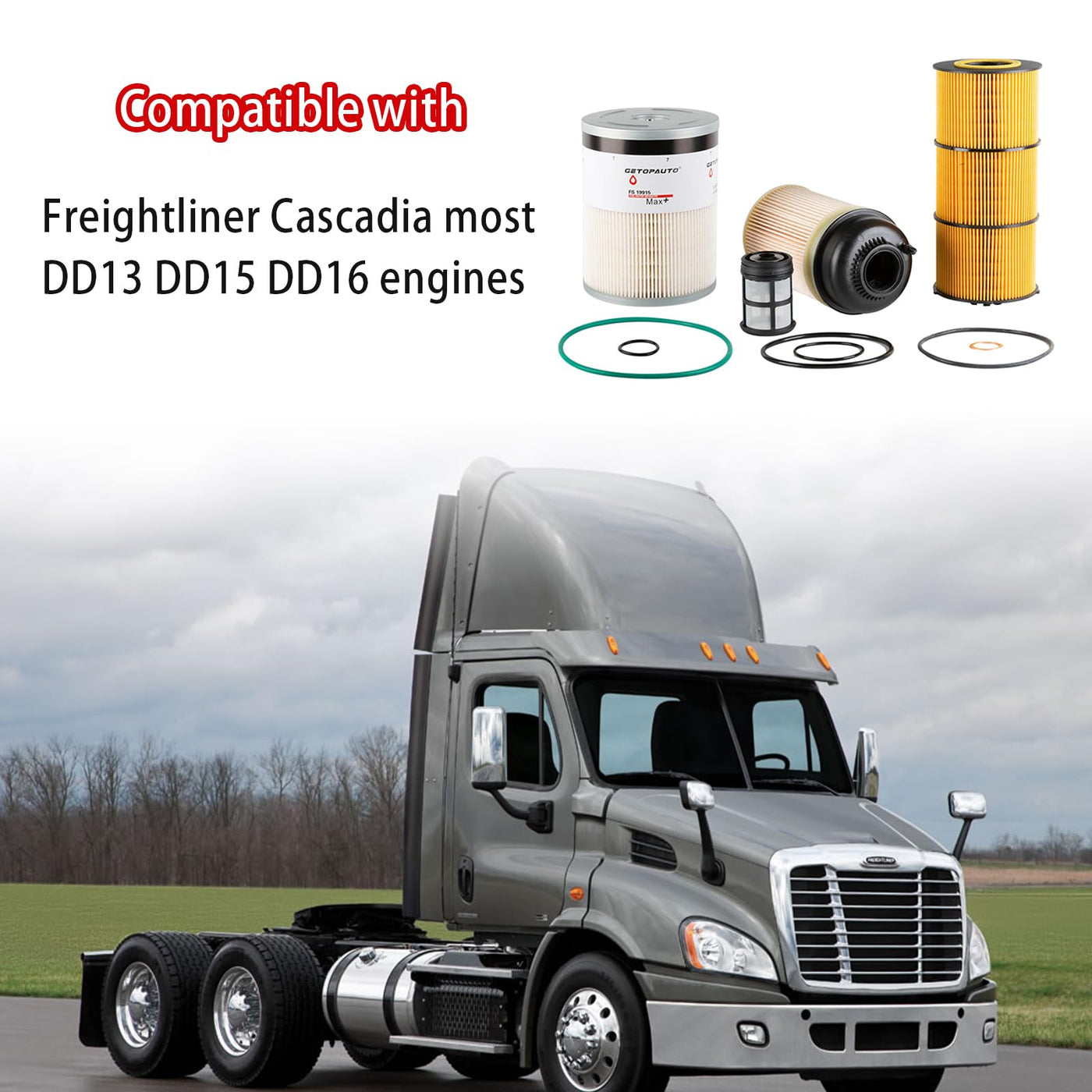 Q: Is the GETOPAUTO Filter Service Kit compatible with my Freightliner Cascadia?A: Yes, the GETOPAUTO Filter Service Kit is compatible with most DD13, DD15, and DD16 engines in Freightliner Cascadia trucks.