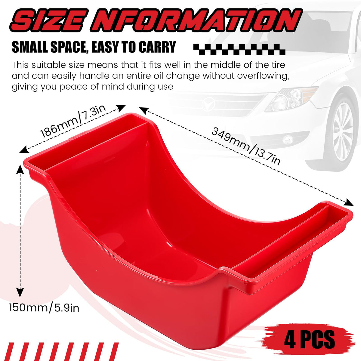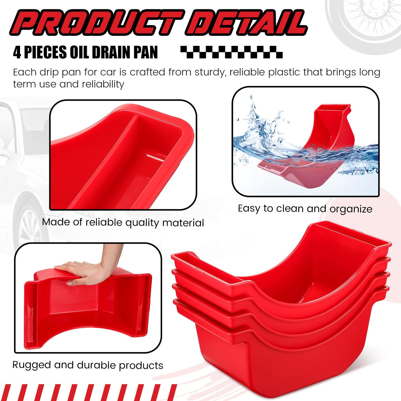 Features: This engine oil drain pan comes in red color, making it stand out in your garage or workspace. You will be not easy to misplace or lose sight of your tool amidst the rest of your equipment. Our car oil drain pan is not only straightforward to handle but also quick to clean, making the oil changing process efficient and hassle free. Save your time and energy with a simple yet effective design. Specifications: Material: plastic Color: red Size: about 13.74 x 7.32 x 5.91 inches/ 34.9 x 18.6 x 15 cm Package includes: 4 x Oil drain pans Notes: Manual measurement, please allow slight errors on size. The color may exist a slight difference due to different screen displays.