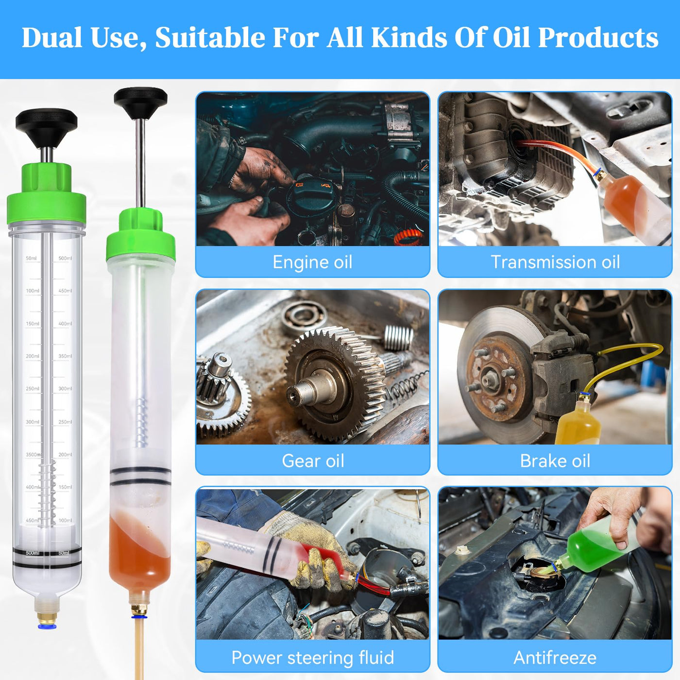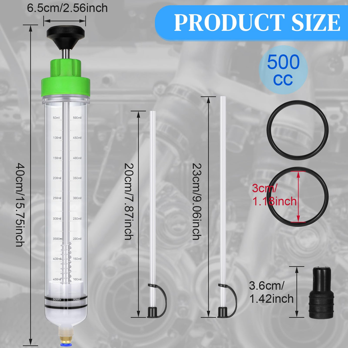 Features: Quality material and design: Experience the fluid management system with our fluid syringe, expertly crafted from robust polyethylene material. This material ensures that the syringe will not rupture or leak, providing long lasting use. The metal alloy gun head is resistant to wear and corrosion, creating a secure seal that prevents accidental detachment of the sucking tube and boosts safety. Dual seal and convenient use: Our liquid pump stands out for its double rubber ring design, which forms an airtight sealing to avoid any leaks and ensure fluid flow is smooth and efficient. The precision thread at the end also works to prevent any seepage, delivering a nice performance. Compact in design and portable, this fluid syringe is easy to store and carry, making it an essential tool for mechanics or hobbyists often working on vehicles. Specifications: Main material: polyethyleneColor: as shownSize: about 11.42 x 2.36 x 2.36 inches/ 29 x 6 x 6 cmCapacity: 500 CCPackage includes: 1 x Clear liquid syringe with locking adapter2 x Extension tubes 2 x Additional rubber seal rings Notes: Manual measurement, please allow slight errors on size. The color may exist a slight difference due to different screen displays.