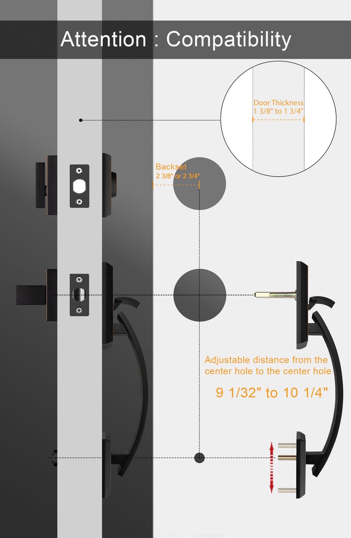 Q: Is the goldenwarm Double Front Door Lock Set adjustable for different door sizes?A: Yes, the set features an adjustable latch that fits 2 3/8" or 2 3/4" backsets and is compatible with doors that are 1 3/8" to 1 3/4" thick.
