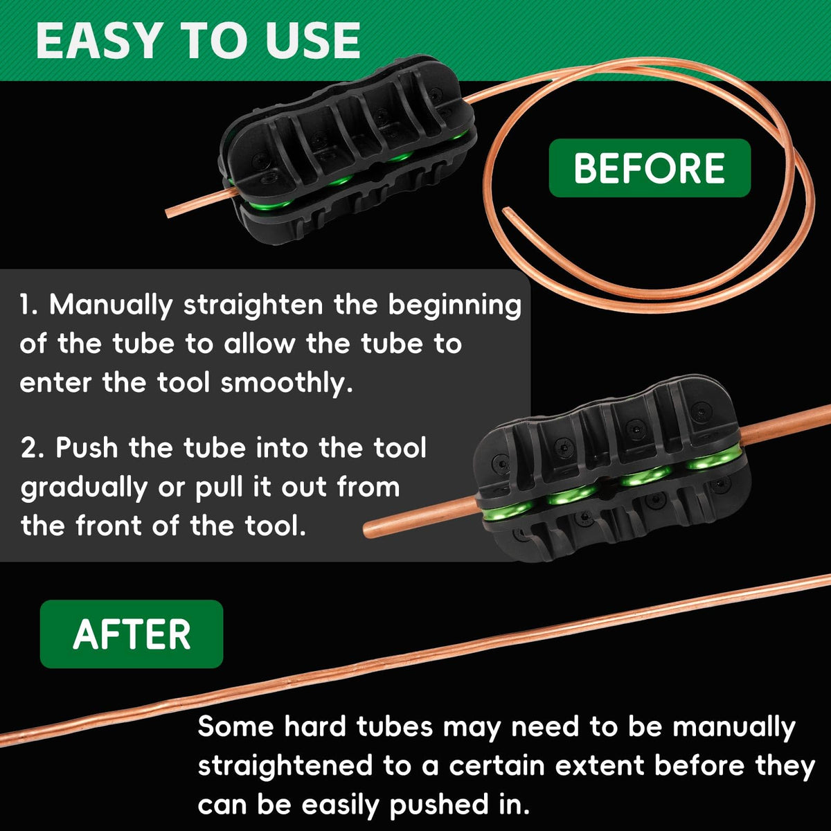 Q: How do I prepare a 3/8-inch copper tube for use with the straightener?A: Before using the straightener, ensure that the 3/8-inch copper tube is bent as straight as possible. Also, check that the opening of the tube is not deformed or flared, which can hinder smooth insertion into the tool.