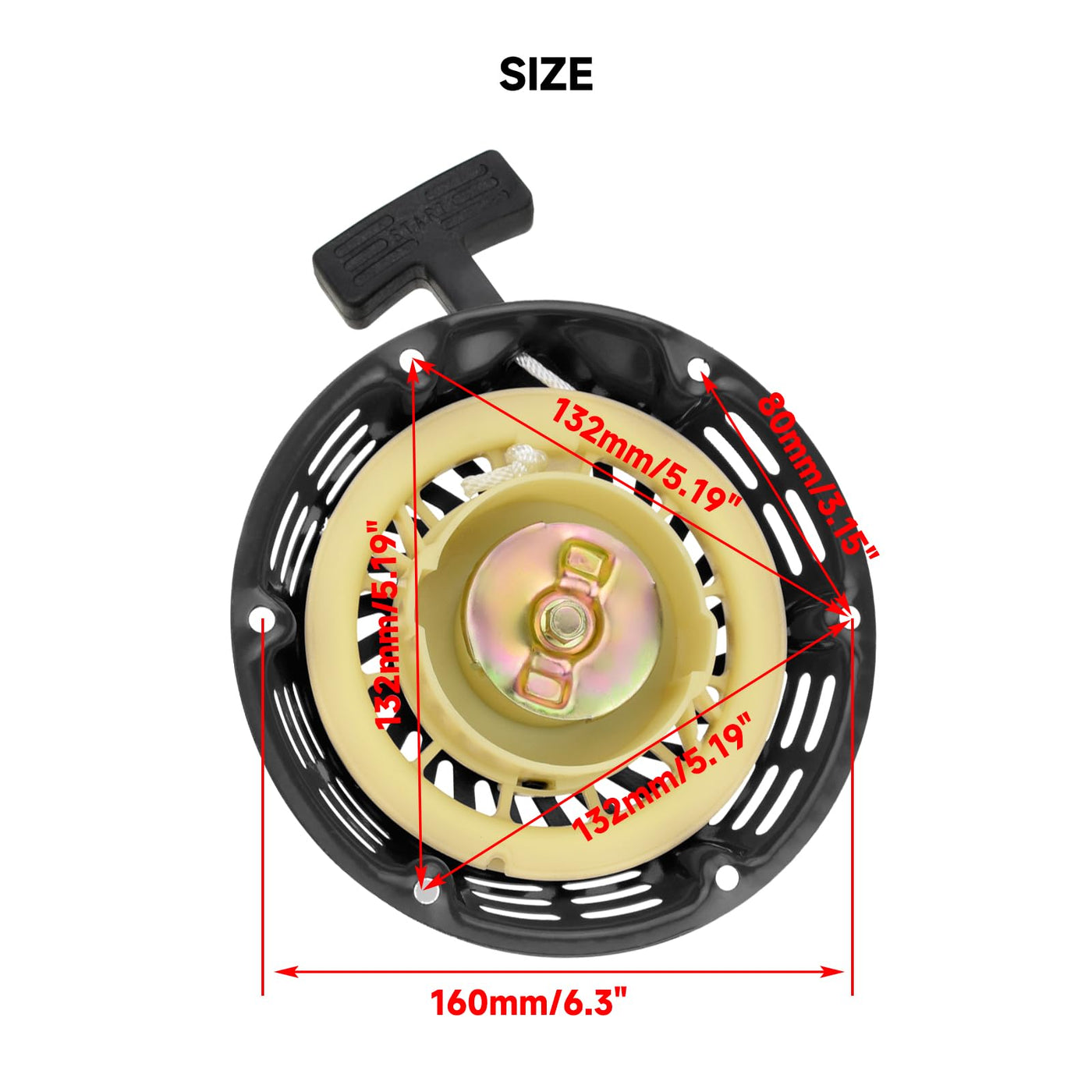 Q: What are the dimensions of the mounting holes for this recoil starter?A: The mounting hole distance is 80mm, with a center-to-center distance for bolt holes measuring 132mm in a triangle pattern and 160mm for diagonal holes crossing the center point.