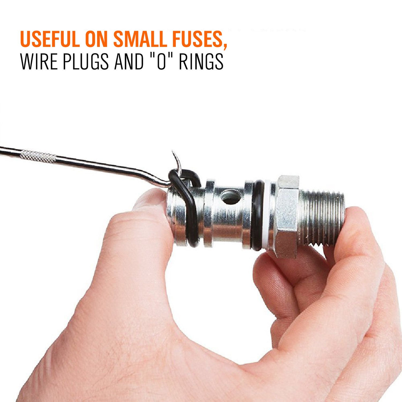 Details: Heavy Duty Hook Set has 4 shapes for pulling clips rings wires gaskets washers and other small parts. The blade extends throughout the handle and is fully heat treated. The two composite handle is designed for comfort and reduced hand fatigue and the patented capped-end handle allows the user to strike the end without damaging the handle. Includes: 1*Scratch Awl 1*90 Degree Hook 1*Complex Hook 1*Curved Hook