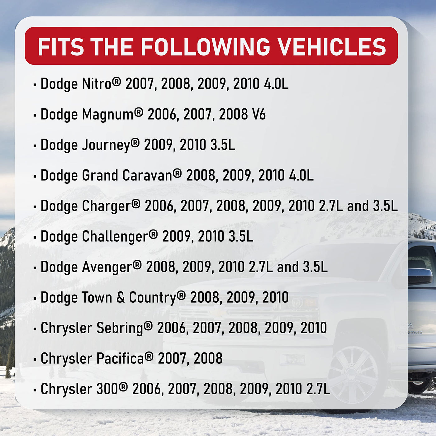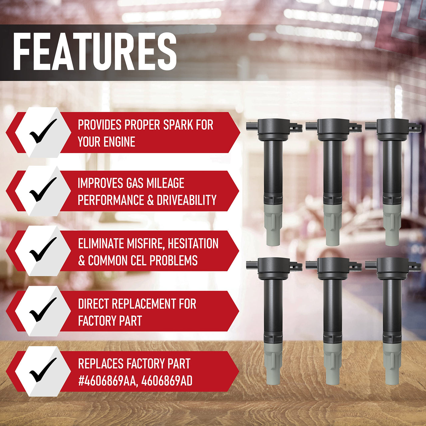 If your or has begun to misfire, idle erratically, or hesitate under acceleration a bad coil pack could be to blame. By providing the proper spark to the spark plug all of these running issues can be resolved. This AA Ignition Coil Pack is a direct replacement for the factory coil. Made by an original equipment supplier (OEM) these coil packs surpass the factory quality and will get your car running how it should be; smooth and fast. This set of 6 Ignition Coil Packs fits the following and models: Nitro 2007, 2008, 2009, 2010 4.0L Magnum 2006, 2007, 2008 V6 Journey 2009, 2010 3.5L Grand Caravan 2008, 2009, 2010 4.0L Charger 2006, 2007, 2008, 2009, 2010 2.7L and 3.5L Challenger 2009, 2010 3.5L Avenger 2008, 2009, 2010 2.7L and 3.5L Town & Country 2008, 2009, 2010 Sebring 2006, 2007, 2008, 2009, 2010 Pacifica 2007, 2008 300 2006, 2007, 2008, 2009, 2010 2.7LReplaces the following part numbers: 4606869AA, 4606869AD, 4606869AC, 52-1827 and Denso GN1031Complete set of 6 ignition coils for your or . This is not a genuine OEM part, the vehicle makes and terms are used only to identify which vehicles this part fits.