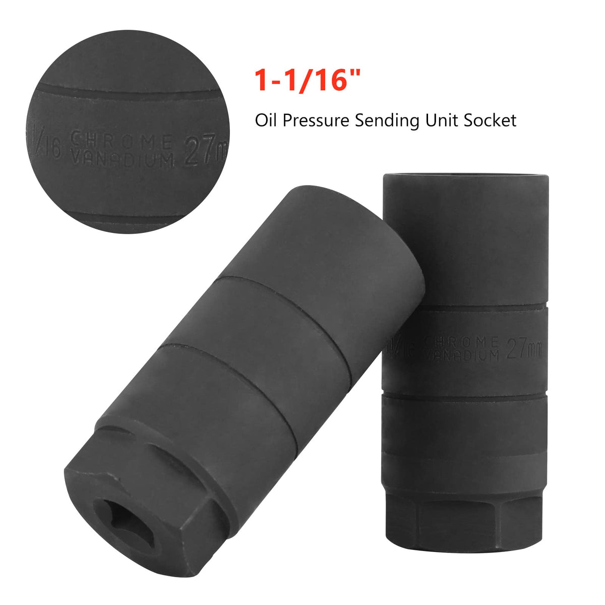 Q: What is the size and depth of this oil pressure sensor socket?A: The iTaimay Oil Pressure Sensor Switch Socket features a special size of 1-1/16 inches (27mm) and has a depth of 2-1/4 inches (57mm), making it suitable for deep oil pressure sending units.