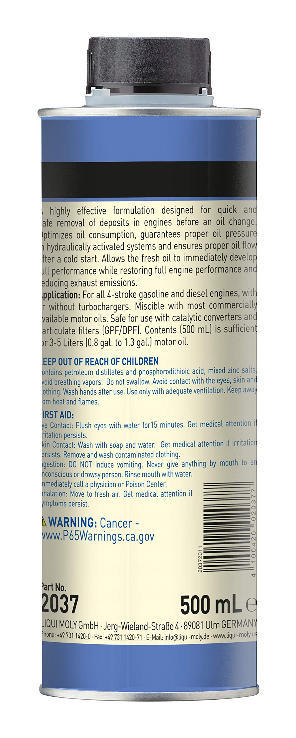 Liquid Moly'S Pro Line Engine Flush Is A Highly Effective Detergent Additives In Engine Flush Clean Interior Engine Before Oil Change. Removes Deposits, Residues From All 4-Stroke Gasoline Engines And Diesel Engines. Dissolves Sludge And Lacquer And Isolates Solid Particles And Liquid Contaminants. Improves The Combustion Process And Restores Full Engine Performance. Prevents Corrosion Of Unprotected Metal Surfaces. Recovers Oil Lubricating Properties. Add To Engine Oil Before Engine Oil Change. Let Engine Run On Idle Speed For 10 Minutes. Drain Oil, Change Oil Filter And Refill With Fresh Liquid Moly Engine Oil. Fully Compatible With All Commercially Available Engine Oils.