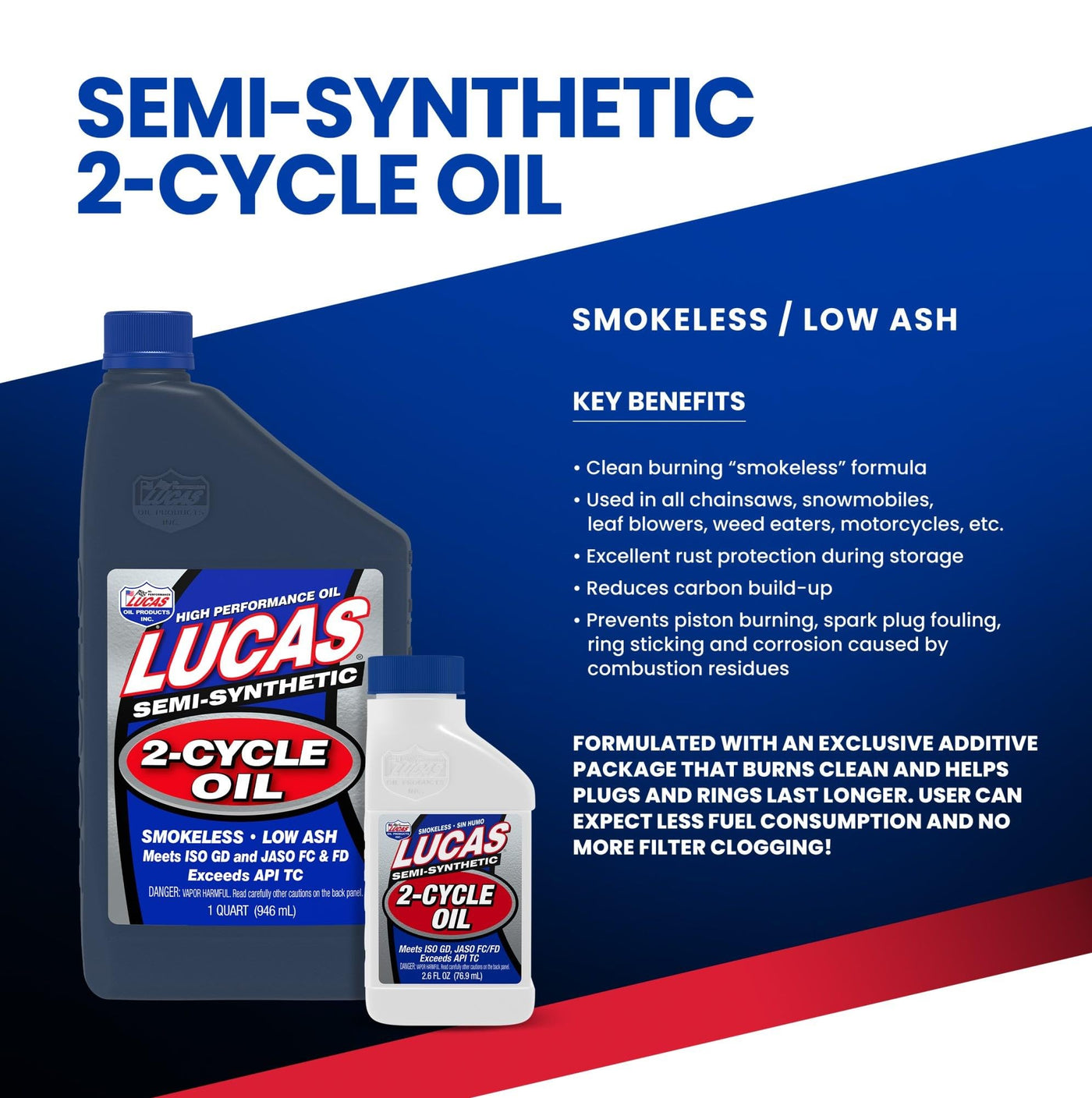 Q: What is Lucas Oil 2-Cycle Oil used for?A: Lucas Oil 2-Cycle Oil is designed for use in air and liquid cooled 2-stroke engines, providing excellent lubrication and preventing carbon deposits in critical areas such as piston rings and exhaust ports.