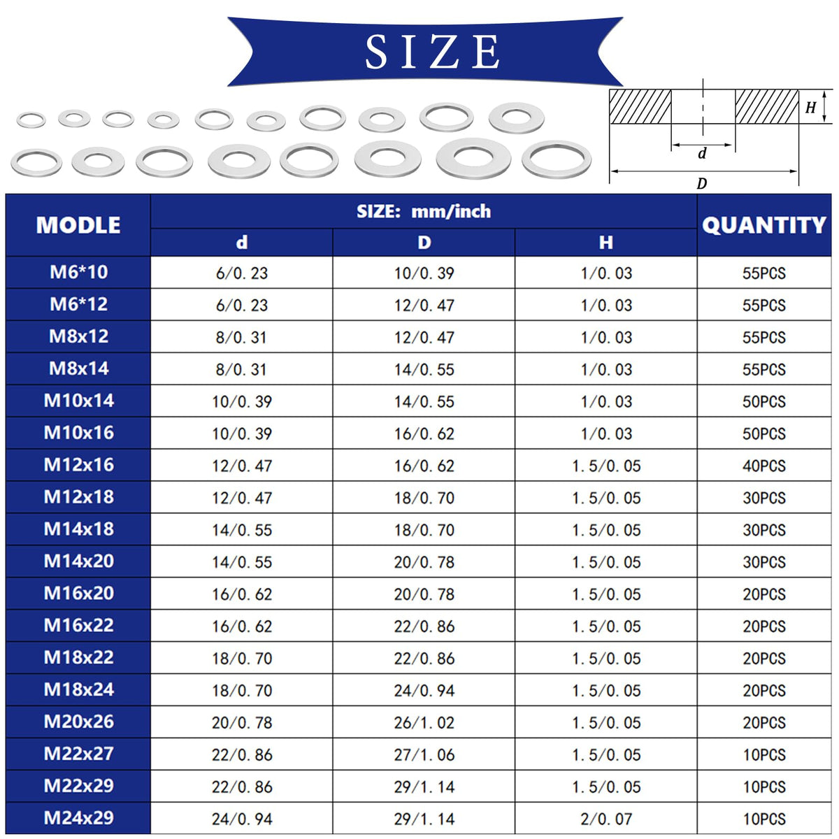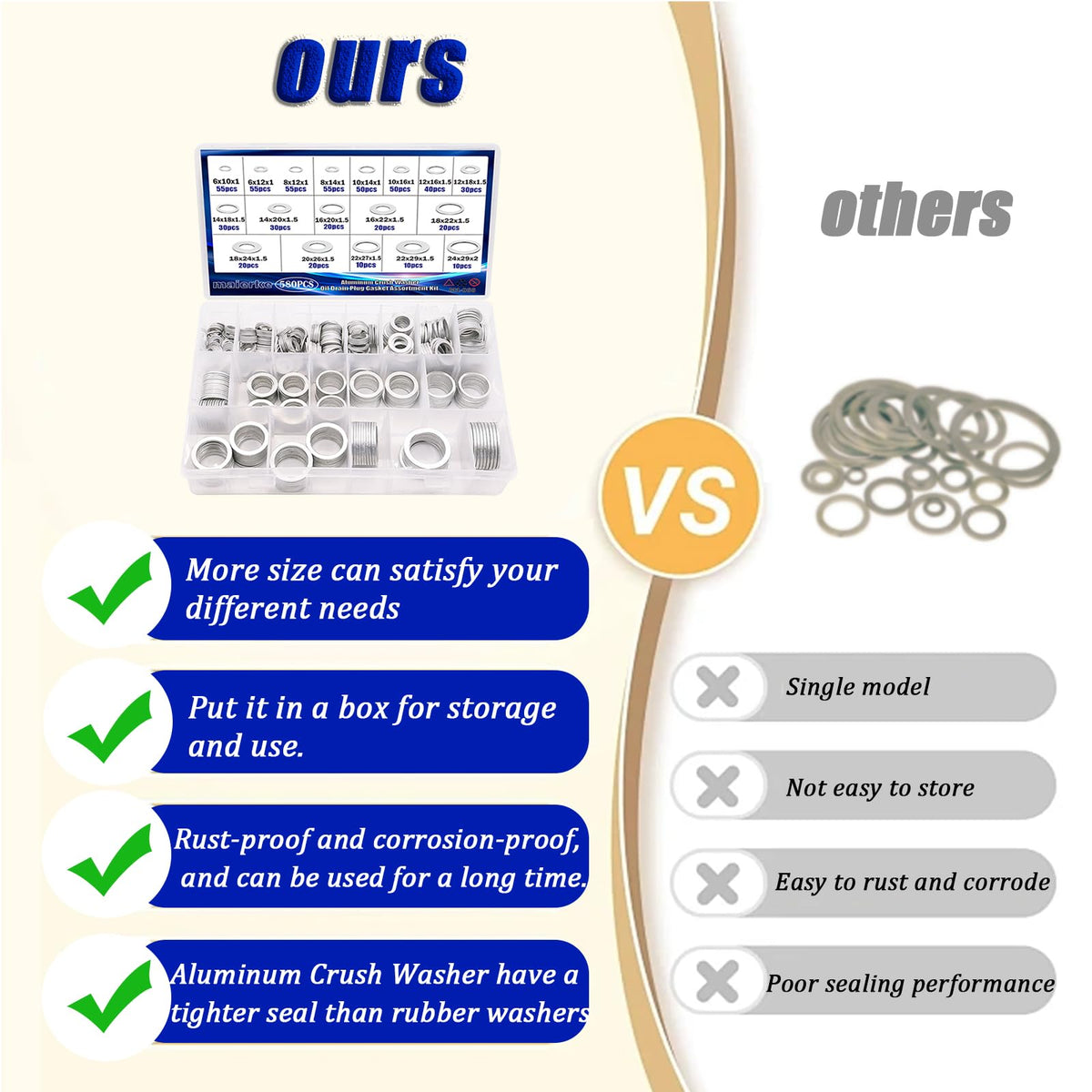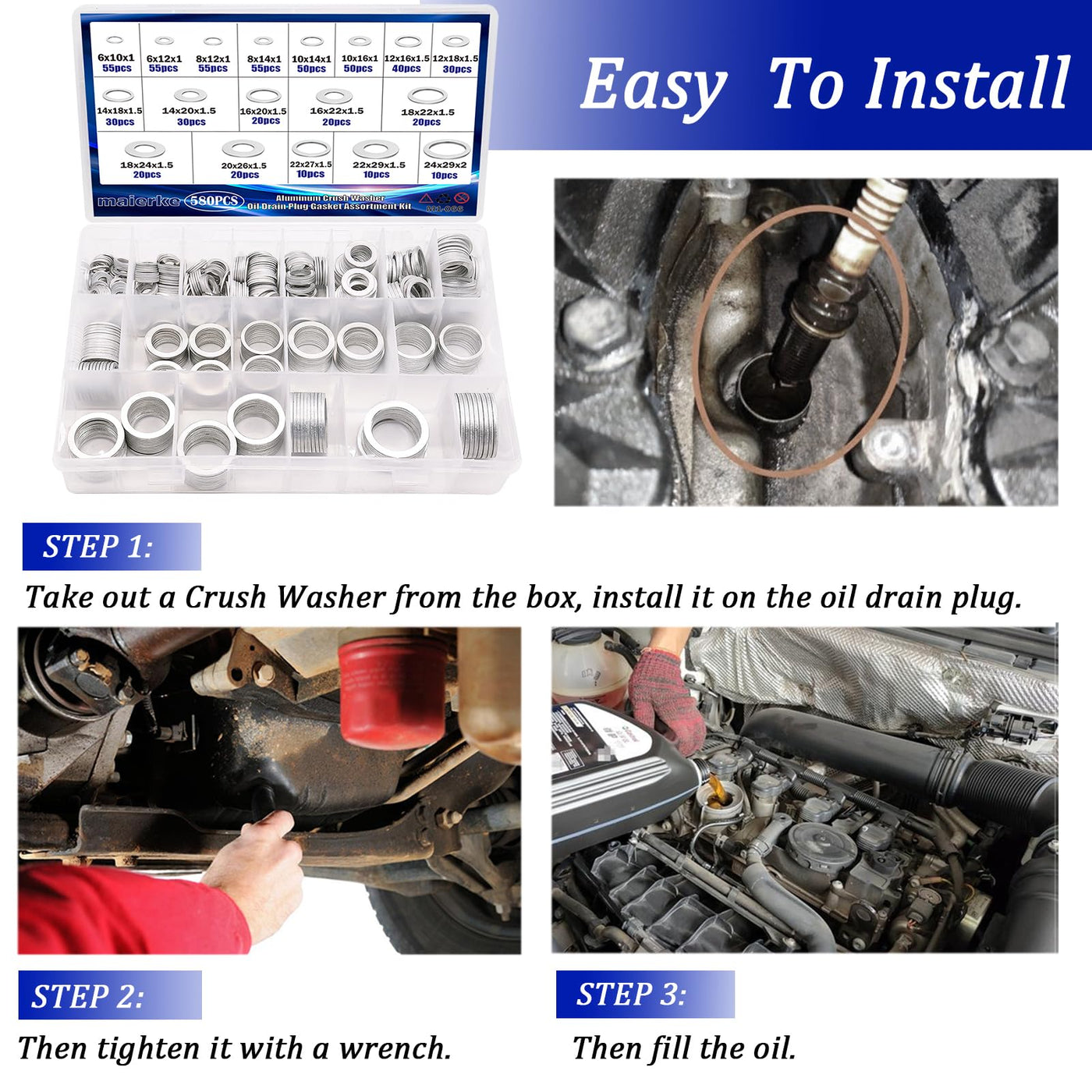 Material: Aluminum Size: 18 Sizes Packing: Plastic Box Total Quantity: 580 PCS Application: Oil plug extrusion washer Automobile oil drain plug kit is usually used between fasteners such as oil drain plug, oil pipe and hydraulic joint, which can reduce the friction between fasteners, disperse pressure and prevent leakage and looseness.