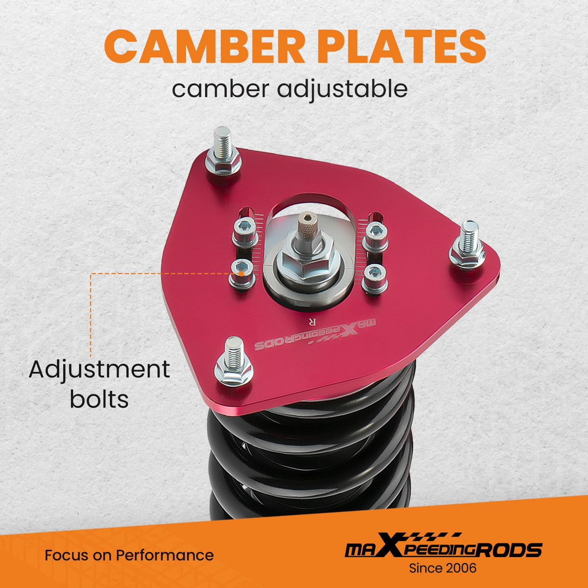 &Nbsp; Specifications Quantity: 2 Pieces Front + 2 Pieces Rear As Shown Hardware, Such As Bolts (Or Clamps) If Any Is Shown In The Picture Above Front Spring Rate: 9Kg/Mm (504Lbs/In) Rearspring Rate: 7Kg/Mm (392Lbs/In) Color: Red Damper: 24 Ways Adjustable Damper Force Adjustable Height: Yes Adjustable Camber Plate: Yes &Nbsp; Features * Adjustable Ride Height * Adjustable Pre-Load Spring Tension * Adjustable Damper -- This Allows You The Ability To Perfectly Dial In Your Coilovers System. You Can Enjoy Confortable Riding Experience In All Road Conditions. * Pillow Ball Top Mount -- This Design Helps Combat Noise While Tuning. It Alsoimproves The Steering Feel And Response * Most Components Are Made From 6061 Aluminum With T6 For Increased Hardness --The Advantages Include Excellent Strength, And Aluminum Helps Keep The Weight Down. * Hi Tensile Performance Spring - Under 600,000 Times Continuously Test, The Spring Distortion Is Less Than 0.04%. With The Special Surface Treatment, The Spring Durability And Performance Are Highly Improved
