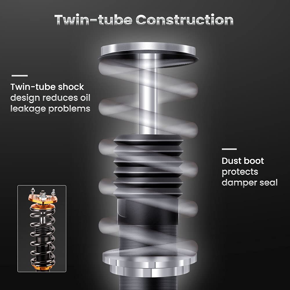 Q: What benefits do these coilovers provide compared to standard suspension systems?A: These coilovers offer adjustable pre-load spring tension and height, improved steering feel, reduced turning noise, and are designed to enhance the overall driving experience through their twin-tube structure.