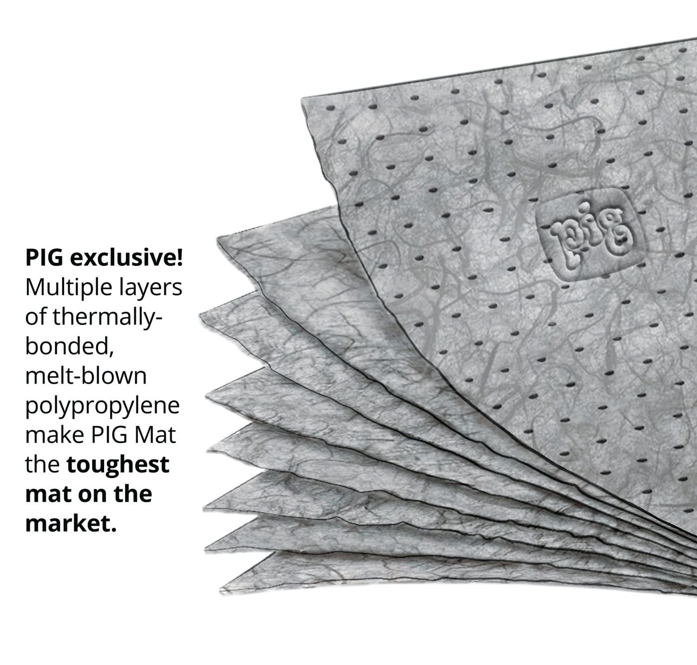Q: What makes PIG Mats different from other absorbent mats on the market?A: PIG Mats are thermally bonded with multiple layers of 100% polypropylene, making them the strongest mats available that won't rip, tear, or fray even when fully saturated.