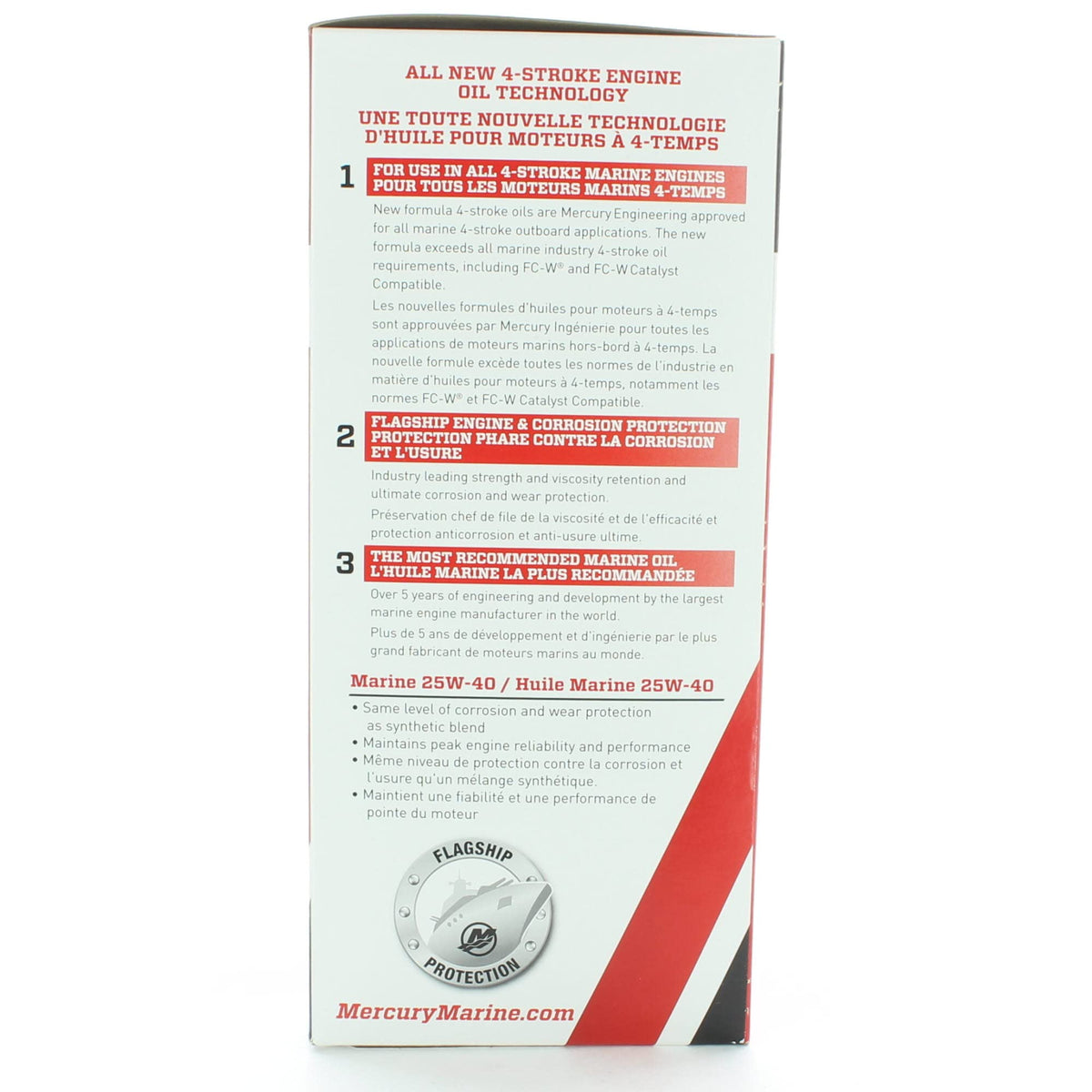 Q: What makes Mercury 25W-40 Marine Engine Oil different from other oils?A: Mercury 25W-40 Marine Engine Oil features the exclusive Flagship Protection formula, which includes advanced anti-wear additives that provide superior camshaft wear protection and enhanced corrosion and oxidation resistance compared to other marine oils.