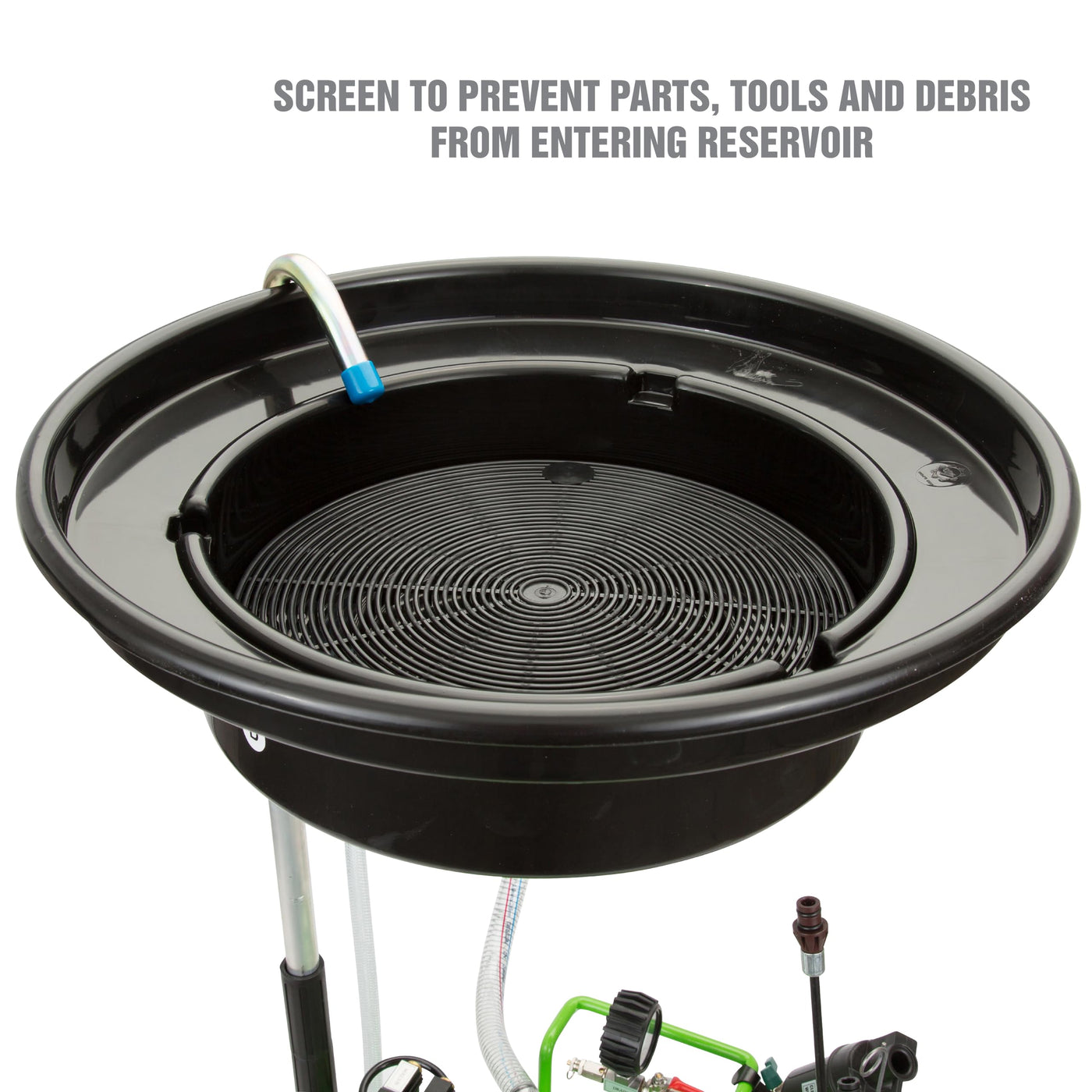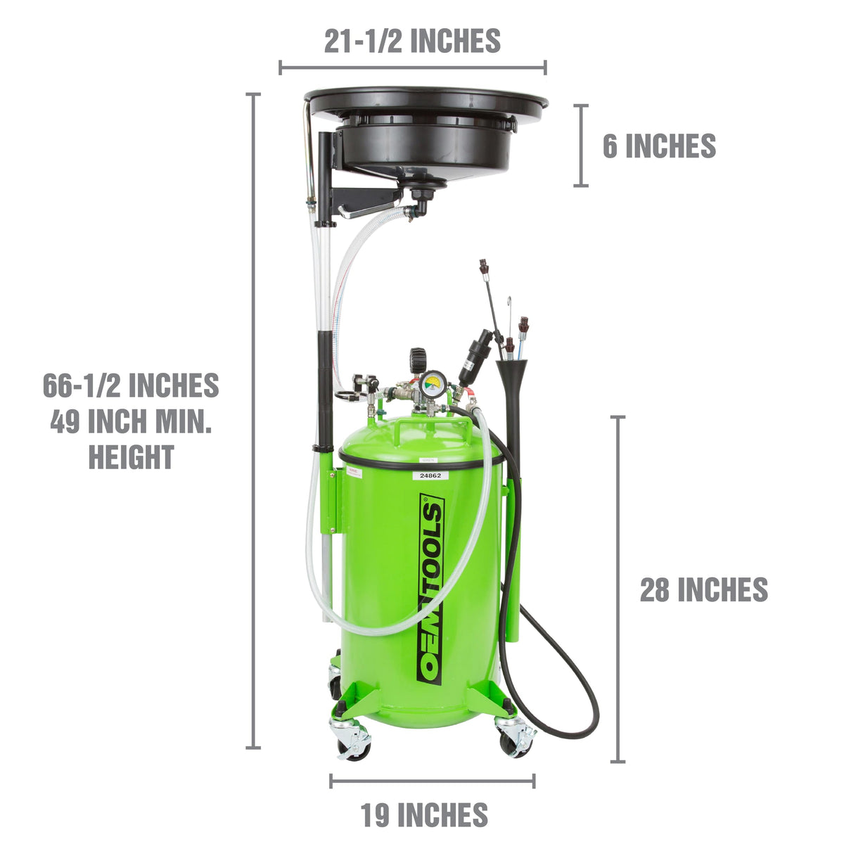 The OEMTOOLS 21 Gallon Lift Oil Drain Vacuum and Extractor is designed for the collection of used fluids including motor oil, transmission fluid, and coolant from under lift-mounted vehicles. Our pneumatic oil dolly is designed to safely capture fluid from vehicles with the use of a large drain lift funnel or vacuum. This oil drain storage tank can service anywhere from 12 to 20 vehicles without needing to be emptied. The oil catch bucket comes with an adjustable funnel, allowing you to adjust the height on this waste oil tank from 45 inches to 62 inches. Our portable oil lift drain has four 3.5-inch casters with a full range of motion, making it easy to transport the oil drain bucket around your shop or garage. This oil disposal container is ingeniously yet simply engineered to catch fluids without spills, and to prevent small parts, tools, and debris from falling into the engine oil drain container with its funnel screen. If you're a mechanic, this car oil extractor is a convenient change oil tool that will save you time and frustration on a daily basis.