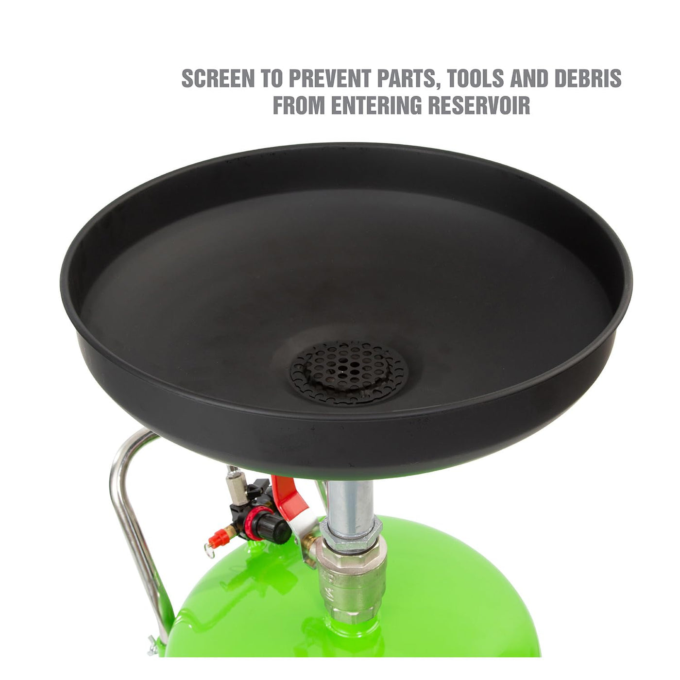 The OEMTOOLS 87042 18 Gallon Metal Oil Drain is designed to efficiently collect motor oil, transmission fluid, and coolant from under lift-mounted vehicles-without making a mess. Outfitted with a standard 1/4 inch NPT M industrial interchange air coupler, this oil change drain tank uses shop air for easy pressurized self-evacuation of oils and fluids. The large 17 inch funnel can be adjusted from 44.5 inches to 68.5 inches of height for a range of lift heights, making it the ideal oil drain tank to follow you from oil change to oil change through the shop. The funnel has a 2.6 gallon capacity, meaning it wont overflow, and also features a filter screen to stop debris, parts, and tools from entering the drain. No more fishing through old oil and oil drains to find a dropped tool or part. The oil change dolly's tank features a superior build quality with a durable chromed drain stem, an all steel oil change tank, beautiful clean welds, and an effortless and smooth oil evacuation mechanism. You can trust that this durable upright oil drain was built to last. Thats why were proud to give this portable oil drain the OEMTOOLS name. Every bit of the OEMTOOLS 87042 Portable Oil Lift Drain Tank was designed with professional mechanics in mind.