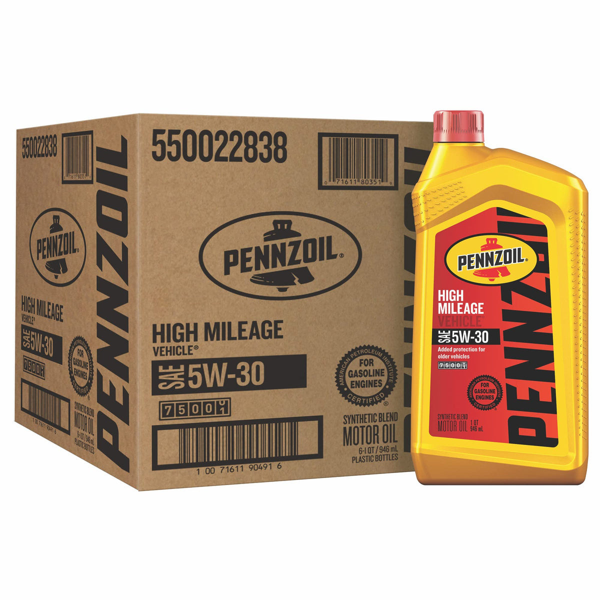 Pennzoil High Mileage 5W-30 Synthetic Blend Motor Oil is designed for engines with more than 75,000 miles, specially formulated to help stop leaks from seals and reduce the oil consumption that is typical of older, worn engines. Severe oil consumption and oil burn-off may also cause other issues, leaving deposits on the internal parts of your engine. Pennzoil High Mileage Motor Oil also helps prevent dirt and sludge from turning into performance-robbing deposits. Pennzoil High Mileage motor oil comes with a warranty coverage of up to 10 years or 300,000 miles*, whichever comes first. (*Pennzoil Motor Oil Lubrication Limited Warranty: Up to 10 years or 300,000 miles, whichever comes first, if you exclusively use Pennzoil motor oil, Pennzoil Professional motor oil, Pennzoil Gold Synthetic Blend motor oil, Pennzoil High Mileage motor oil, Pennzoil High Mileage Full Synthetic motor oil, or Pennzoil Full Synthetic motor oil. Your engine must have fewer than 125,000 miles and have been manufactured in the past 72 months. To maintain your warranty, change your vehicle’s oil and oil filter at least as often as recommended by the vehicle manufacturer. Enrollment required. Keep your receipts. Other conditions apply. See pennzoil.com/warranty to enroll and for full details and terms.)