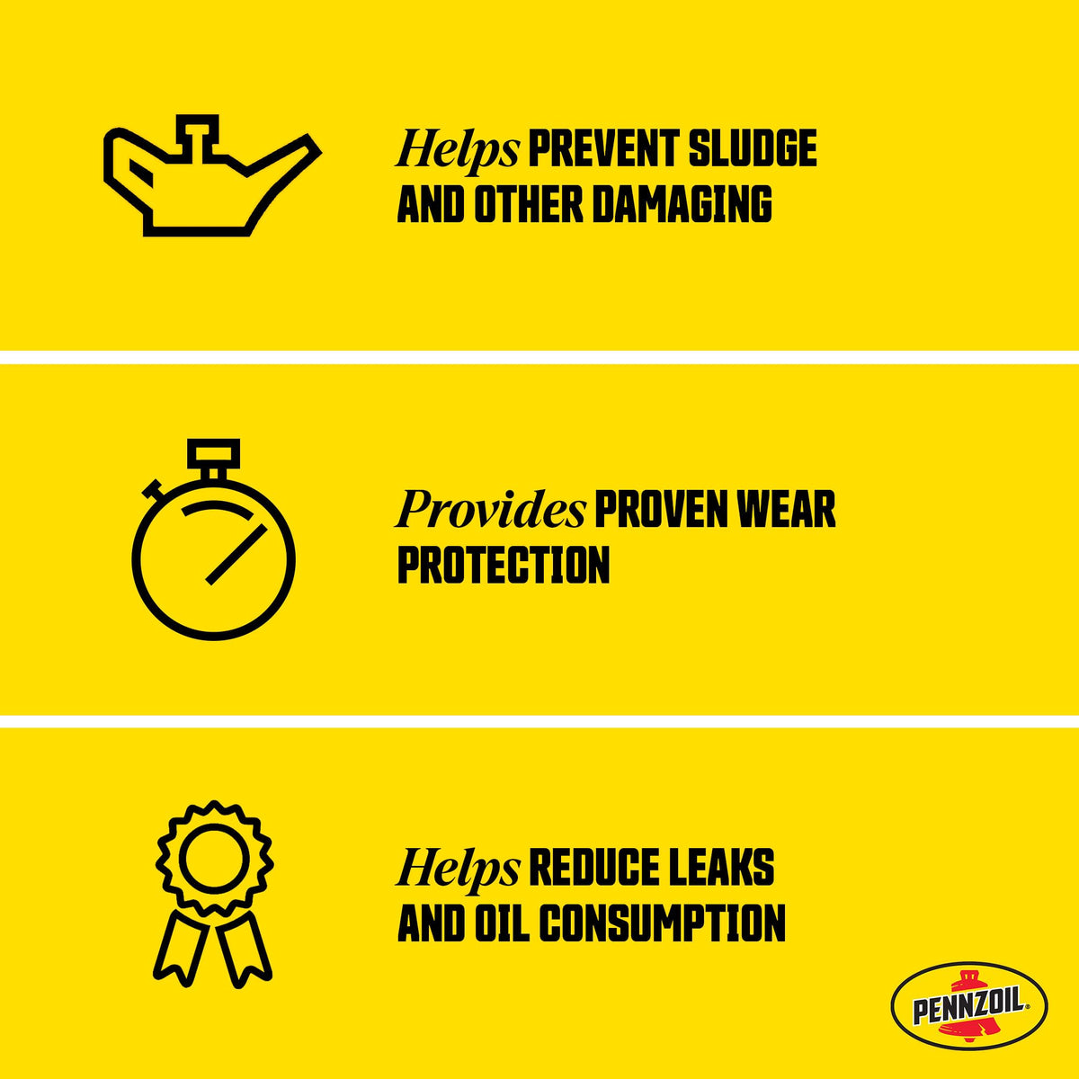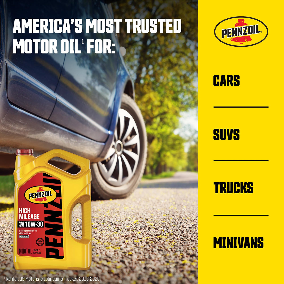 Pennzoil High Mileage Sae 10W-30 Motor Oil Is Engineered For Cars That Have Accumulated More Than 75,000 Miles And Provides Proven Wear Protection. As Your Car Ages, Leaks May Develop And Cause Higher Oil Consumption And Burn Off Which Is Why Your Engine Might Be Needing Frequent Top-Offs. Severe Oil Consumption And Oil Burn Off May Also Cause Other Issues, Leaving Deposits On The Internal Parts Of Your Engine. Pennzoil High Mileage Motor Oil Is Enhanced With An Outstanding Combination Of Special Conditioning Seal Agents And Additives To Help Stop Leaks From Aging Seals, Reduce The Oil Consumption That Is Typical Of Older And Worn Engines, And Helps Prevent Sludge And Other Damaging Deposits. Pennzoil High Mileage Motor Oil Comes With Free Warranty Coverage Of Up To 10 Years Or 300,000 Miles* (Whichever Comes First). It Meets Or Exceeds The Following Oem Requirements: Chrysler Ms-6395. Meets Or Exceeds The Requirements Of The Following Industry Specifications: Api Sp-Rc And All Previous Categories; Ilsac Gf-6A. For A Full List Of Equipment Approvals And Recommendations, Please Consult Your Local Shell Technical Help Desk And Always Consult Your Owners Manual. (*Pennzoil Lubrication Limited Warranty: Up To 10 Years Or 300,000 Miles, Whichever Comes First, If You Exclusively Use Pennzoil Motor Oil, Pennzoil Professional Motor Oil, Pennzoil Gold Synthetic Blend Motor Oil, Pennzoil High Mileage Motor Oil, Or Pennzoil Full Synthetic Motor Oil. Your Engine Must Have Less Than 125,000 Miles And Have Been Manufactured In The Past 72 Months. To Maintain Your Warranty, Change Your Vehicles Oil And Oil Filter At Least As Often As Recommended By The Vehicle Manufacturer. Enrollment Required. Keep Your Receipts. Other Conditions Apply. See Pennzoil.Com/Warranty For Full Details And Terms.)