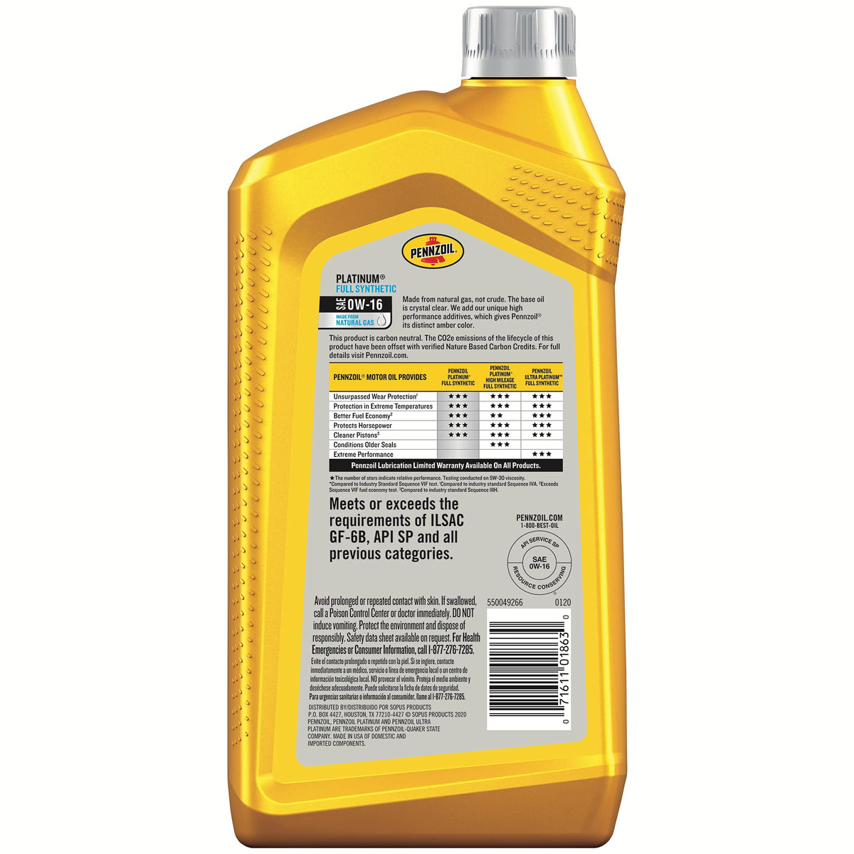 Pennzoil Platinum Full Synthetic Sae 0W-16 Motor Oil Is Made With Natural Gas, Not Crude Oil It Is A First-Of-Its-Kind Full Synthetic Motor Oil Made With Natural Gas And Designed For Complete Protection For Top Engine Performance Formulated For Modern Turbocharged Engines, Pennzoil Platinum Full Synthetic Motor Oil Keeps Pistons Up To 45% Cleaner Than Required By The Toughest Industry Standard (Based On Sequence Iiih Results), Provides Better Fuel Economy (Based On The Latest Industry Standard), Helps Protect Engines From Loss Of Power, Provides Unsurpassed Wear Protection (Based On Sequence Iva Wear Test Using Sae 5W-30), And Provides Excellent Performance In Extreme Temperatures It Is Uniquely Engineered From Our Revolutionary Pureplus Gas-To-Liquid Technology, Which Is A Patented Process That Converts Pure Natural Gas Into A High Quality, Full Synthetic Base Oil Our High-Quality Base Oil Contains Fewer Impurities Than Base Oils Made From Crude Oil, And When Combined With Our Advanced Additive Technology Creates One Of The Best Formulations In Our Pennzoil Portfolio Pennzoil Platinum 0W-16 Full Synthetic Motor Oil Is A Carbon Neutral Motor Oil, Achieved Through Verified Nature Based Carbon Credits That Offset The Co2 Lifecycle Emissions For Full Details, Visit The Pennzoil Website Meets Or Exceeds The Requirements Of The Following Industry Specifications: Api Sp, Api Sp-Resource Conserving Ilsac Gf-6B For A Full Listing Of Equipment Approvals And Recommendations, Please Consult Your Local Shell Technical Helpdesk