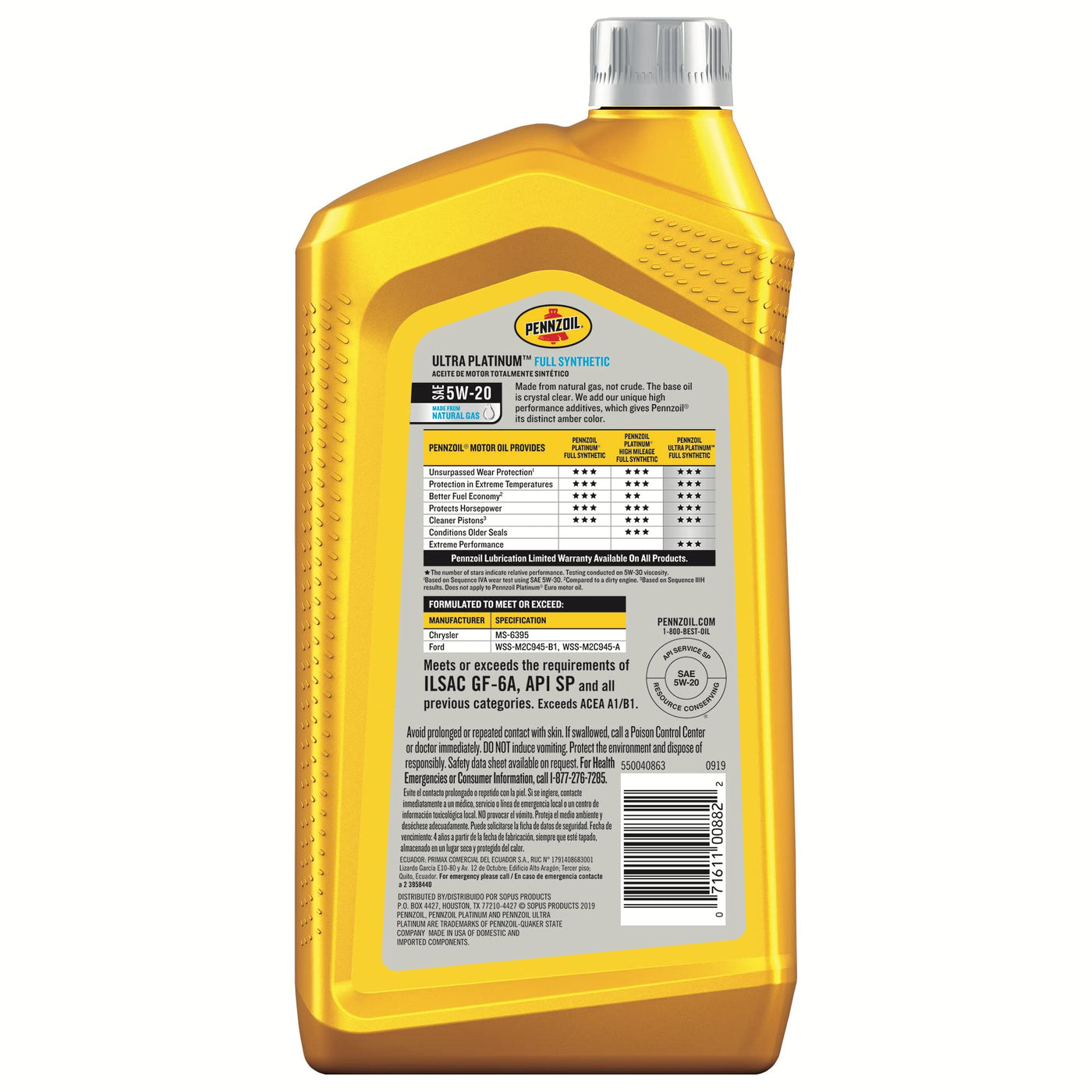 Pennzoil Ultra Platinum Full Synthetic 5W-20 Motor Oil Is Made With Natural Gas, Not Crude Made For Extreme Performance, Pennzoil Ultra Platinum Outperforms Conventional Oils In Terms Of Low-Temperature Performance And Volatility Control Our Full Synthetic Motor Oils Are Uniquely Engineered From Our Revolutionary Pureplus Technology Which Is A Patented Process That Converts Pure Natural Gas Into A High Quality, Full Synthetic Base Oil Because It Is Made With Natural Gas, The High-Quality Base Oil Contains Fewer Impurities Than Base Oils Made From Crude Oil, And When Combined With Our Advanced Additive Technology Creates One Of The Best Formulations In Our Pennzoil Portfolio Pennzoil Ultra Platinum Far Exceeds The Most Stringent Car Manufacturer Requirements For Cleanliness And Protection (Based On Ilsac Gf-6), And Is Suitable For All Car, Suv, Light Van, Truck Gasoline, And Turbocharged Engines Under All Driving Conditions Meets Or Exceeds The Following Oem Requirements: Fca Ms-6395 Ford Wss-M2C945-B1 And Wss-M2C945-A Exceeds The Requirements Of The Following Industry Specifications: Api Sp, Api Sp-Resource Conserving And All Previous Categories Ilsac Gf-6A Acea A1B1 For A Full Listing Of Equipment Approvals And Recommendations, Please Consult Your Local Shell Technical Helpdesk