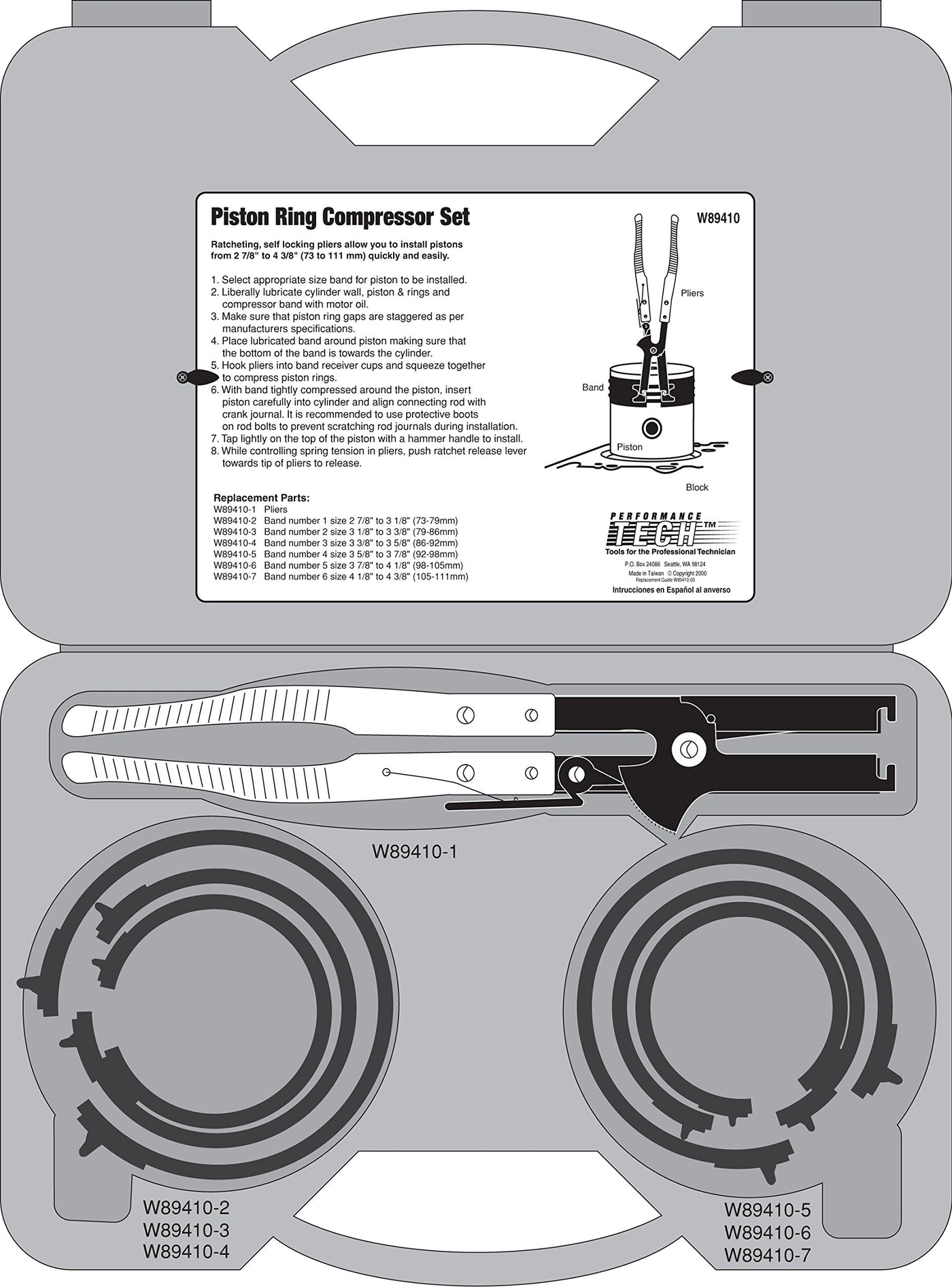 Q: What sizes of piston rings does the Performance Tool W89410 Piston Ring Compressor Set accommodate?A: The Performance Tool W89410 Piston Ring Compressor Set includes six sizes of bands that fit various piston sizes, accommodating SAE sizes from 2 7/8" to 4 3/8" and metric sizes ranging from 73mm to 111mm.
