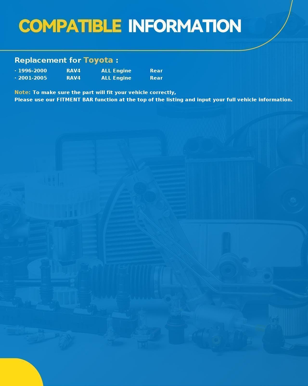 ?Vehicle Fitment?PHILTOP struts fit for RAV-4 1996 1997 1998 1999 2000 2001 2002 2003 2004 2005 | ?Direct Replacement?Shock absorber replacement to 37199, 343272, 341534, 341535, G63860, 61651, 343314, 172127, KG4738, 343313, KG5524, 12120022, 69813, 12120058, 7837199 | ?Superior Performance?Struts complete assembly is made of high quality materials.Struts and shocks are manufactured in strict accordance with the original factory standards, with stable performance and exquisite workmanship. After strict factory quality control test, it meets or exceeds the service life requirement of original equipment. | ?Direct Fit?Struts and shocks complete assembly designs to ensure exact fit and easy direct replacement installation. | ?Verify Reminder?Please use Amazon 's vehicle matching tool, which is located at the top of the list above the picture on your desktop, to confirm that the strut is correct for your vehicle. If you have any questions, please feel free to contact us, we will reply you within 24 hours.