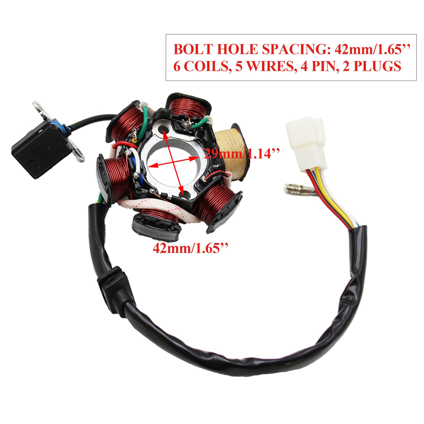 6-Coil 5wires stater magneto, ATV Quad Go Kart magneto stator plate for 50cc 70cc 90cc 110cc 125cc engine for ATV Go Kart Buggy Part Dirt Bike. 1.May fits for most Chinese made 50cc 70cc 90cc 100cc and 110cc 125cc ATVs Pocket Bikes Choppers Go-Karts Dirt Bikes. 2. 50cc 70cc 110cc 125cc ATV Go-Karts Dirt Bike TaoTao Baja Sunl. 3. For 50cc-125cc electrical start ATV Dirt Bike Go Kart. The specification: 5 wires (red balck, white, blue white, green, yellow). Distance Between Mount Holes (Centre to Centre) around 1.65 (42mm). Please check the pictures and specifications for compatibility before placing orders, if meet questionos of the parts please conact us freely , thanks.