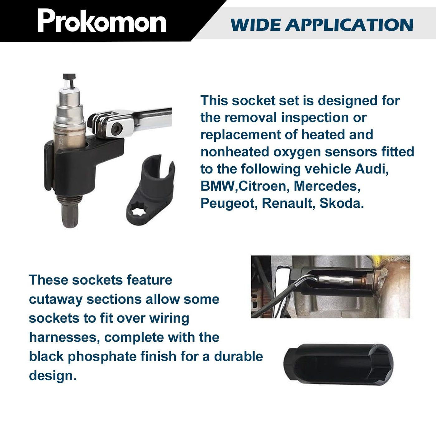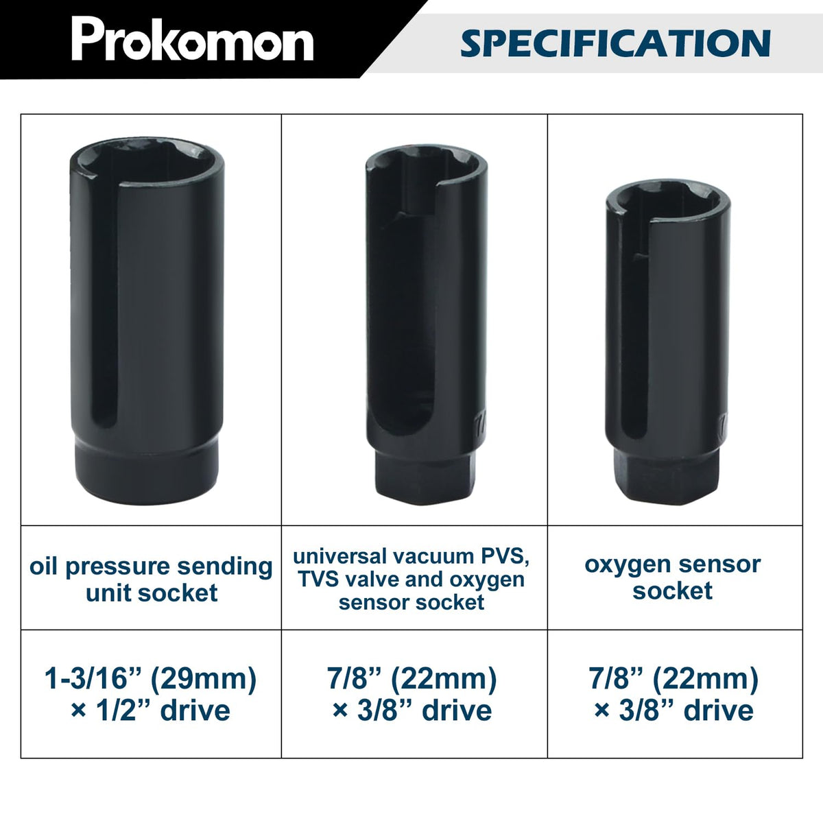 1pc 1/2'' Drive x 27mm (12 point) oil pressure sending unit socket. 1pc 1/2'' Drive x 29mm (6 point) pressure/vacuum switch socket with slot.Designed to be used with 1/2'' drive tool. 1pc 1/2'' Drive x 7/8''or 22mm (6 point) long oxygen sensor wrench socket with the slot. 1pc 3/8'' Drive x 7/8'' or 22mm (6 point) vacuum switch socket with slot. 1pc 3/8'' Drive x7/8'' or 22mm (6 point) vacuum switch socket with the slot. 1pc 3/8'' Drive x 1-1/16'' & 1''or 27mm (6 point) oil pressure sending unit socket. Can be used with a 3/8'' drive ratchet or 1-1/8'' wrench. 1pc 3/8'' DR x 7/8''or 22mm (6 point) short oxygen sensor wrench socket with slot.