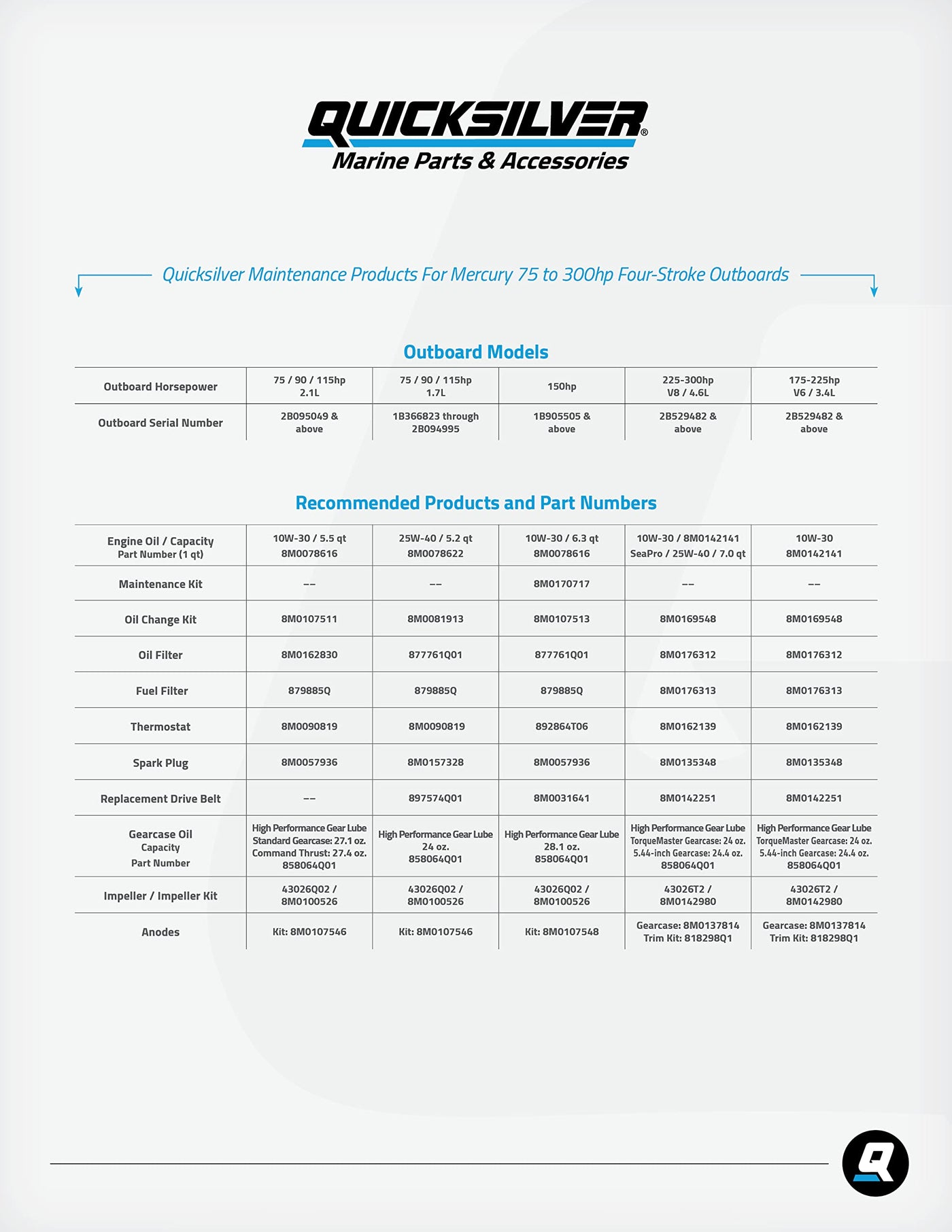 Oil Change Kit 8M0081913 Is For Use On Mercury 75-115Hp 4-Stroke Efi Outboards (Serial No. 1B366823 Through 2B094995). The Kit Includes 5L/1.41 Gallons Of Quicksilver 25W40 4-Stroke Oil, Oil Filter, Drain Plug Seal And Plastic Drip Tray (As Applicable To Specific Engines). Buy One Box With All The Necessary Items For Your Quick And Easy Oil Change. The Quicksilver Brand Is The Leader In Delivering Uncompromising Engine Oils, Parts And Accessories To The Marine Industry For Over 65 Years. Quicksilver Is The Premier Supplier Of Mercury Marine Original Equipment Replacement Engine Parts, Oils, And Accessories, But Also Works To Serve All Original Equipment Brands In The Marine And Powersports Industries. It Has Earned A Loyal Following By Providing The Highest Quality Products That Are Tested Through Some Of The Most Rigorous Environments And Testing Procedures. No Aftermarket Company Comes Close To The Level Of Research And Design As Quicksilver; Buying Quicksilver Is Buying Performance, Protection And Peace Of Mind.