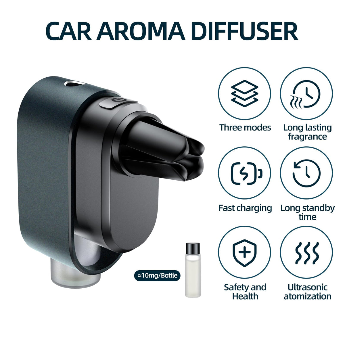 Smart Car Air Freshener Diffuser: Designed to fit most car vents, this sleek diffuser utilizes ultrasonic mist technology and features a 220mAh rechargeable battery for up to 45 days of continuous fragrance. Choose from three adjustable spray modes with simple touch controls to customize your cars aroma experience. Components Included: Diffuser Unit Essential Oils (4 bottles) USB Charging Cable User Manual Important Safety Information: Not Edible Keep Away from Children and Pets Avoid Contact with Skin and Eyes Store Vertically to Prevent Spillage