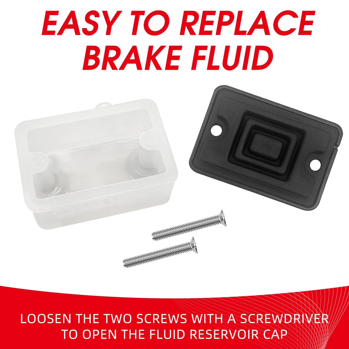 Q: How do I install the rear brake master cylinder fluid reservoir?A: To install the reservoir, simply unscrew the two screws on the top of your existing brake fluid reservoir. Replace it with the new reservoir cup assembly and reattach the screws. It's designed for easy installation, allowing you to complete the process quickly.