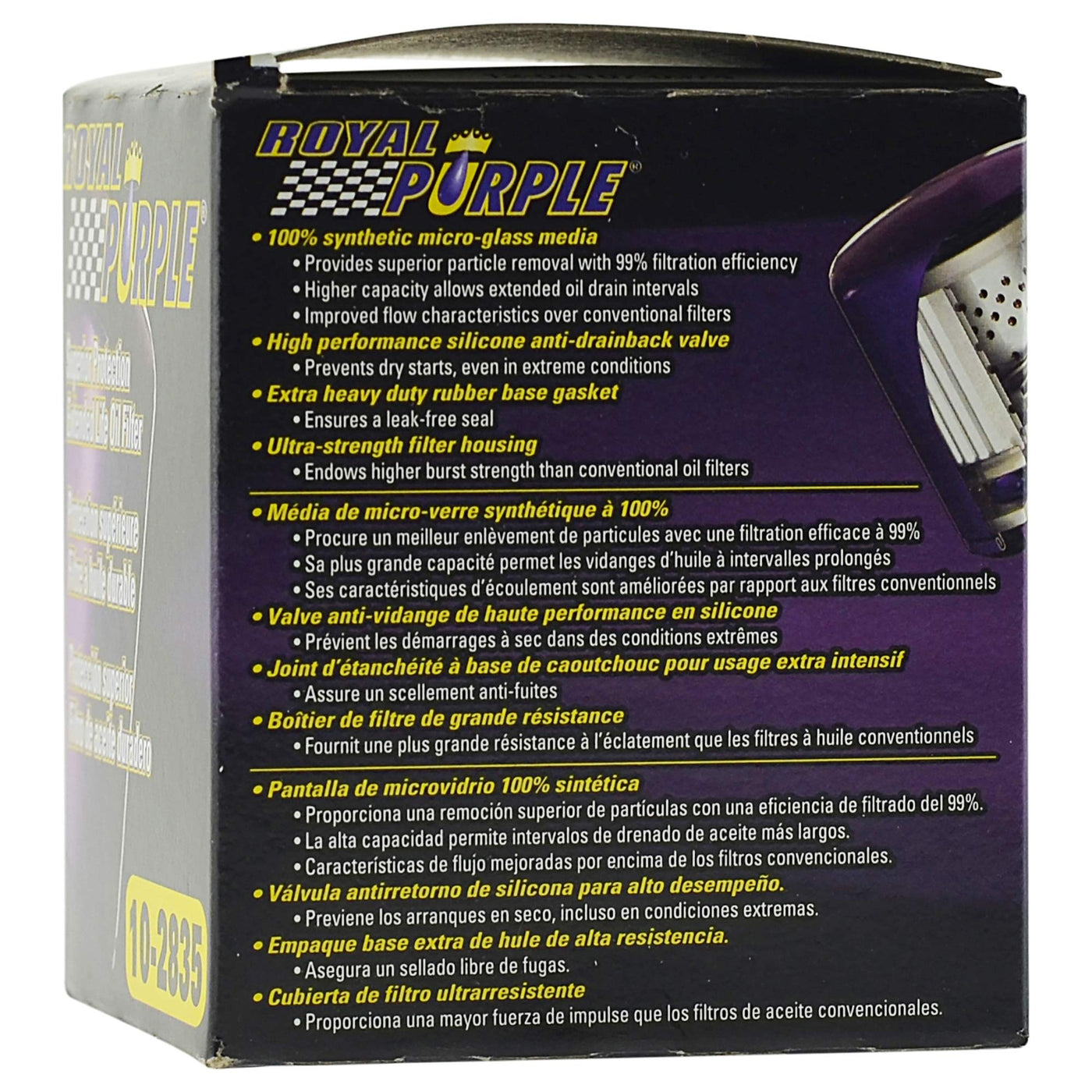 Royal Purple Oil Filters Provide Superior Particle Removal, High-Performance And Optimized Flow Characteristics For Maximum Performance And Longer Filter Life. Each Filter Features 100 Per Cent Micro-Glass Media For Superior Particle Removal With 99 Per Cent Filtration Efficiency At 25 Microns. It Features A Thicker Shell Material For Extra Strength. The Heavier Shell Provides Extra Security Against Puncture From Road Debris. The By-Pass Valve Is Designed To Insure Oil Flow In Situations Of Excessive Filter Element Flow Restriction. An Extra Heavy Duty Premium Nitrile Rubber Base Gasket Ensures A Leak-Free Seal And Its Special Lubricity Compound Reduces Torque During Installation And Removal. An Ultra-Strength Filter Housing Endures Higher Burst Strength Than Conventional Filters. A High-Performance Silicone Anti-Drain Back Valve Prevents Dry Starts By Eliminating Oil Drain Back During Shutdown. Silicone Outperforms And Outlasts Standard Nitrile Rubber In Both Extreme Cold And Hot Oil Temperatures.