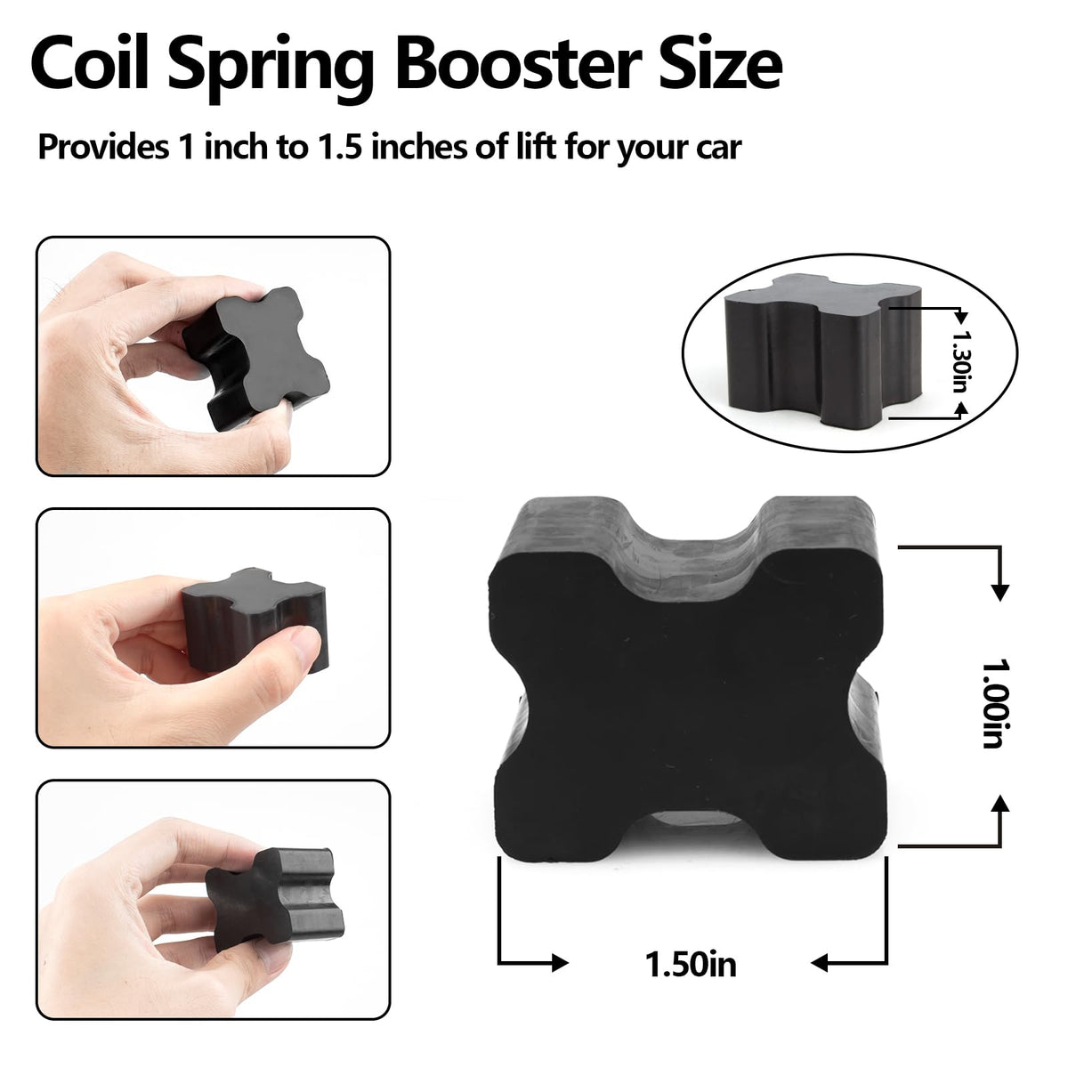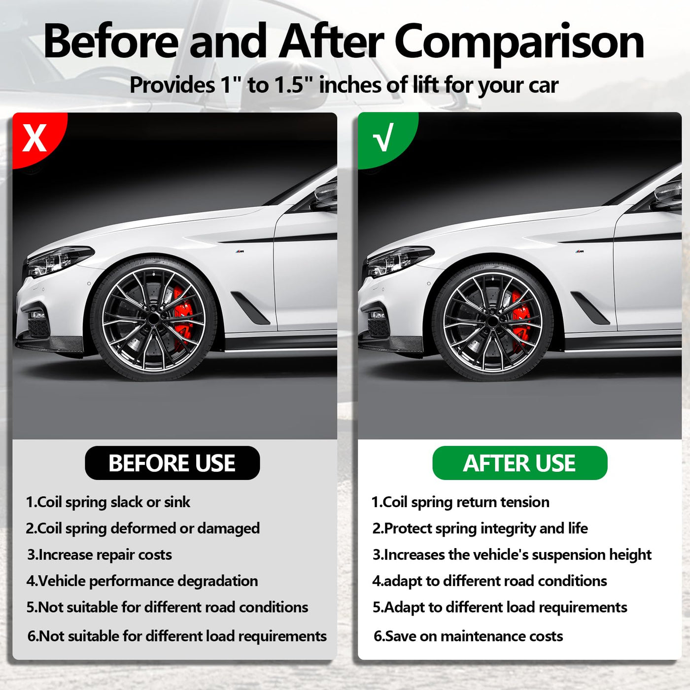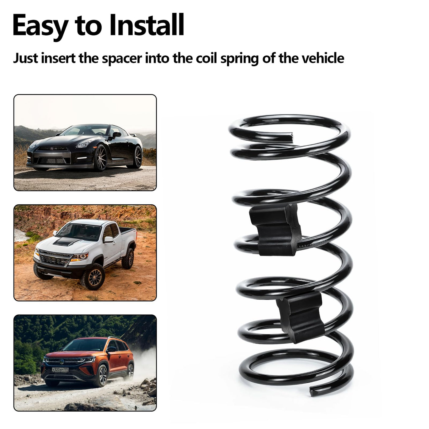 Auto Spring Spacer Features: ?Rubber Suspension Blocks Can Increase The Tension And Height Of The Spring, Which Is Suitable For The Front And Rear Wheel Springs Of Most Models; ?Rubber Spring Lift Blocks Can Provide About 1 Inch To1.5 Inches Of Lifting Effect; ?The Coil Spring Adjuster Is Cost-Effective And Easy To Install, Which Helps Improve The Car'S Suspension Performance And Make Driving More Comfortable.