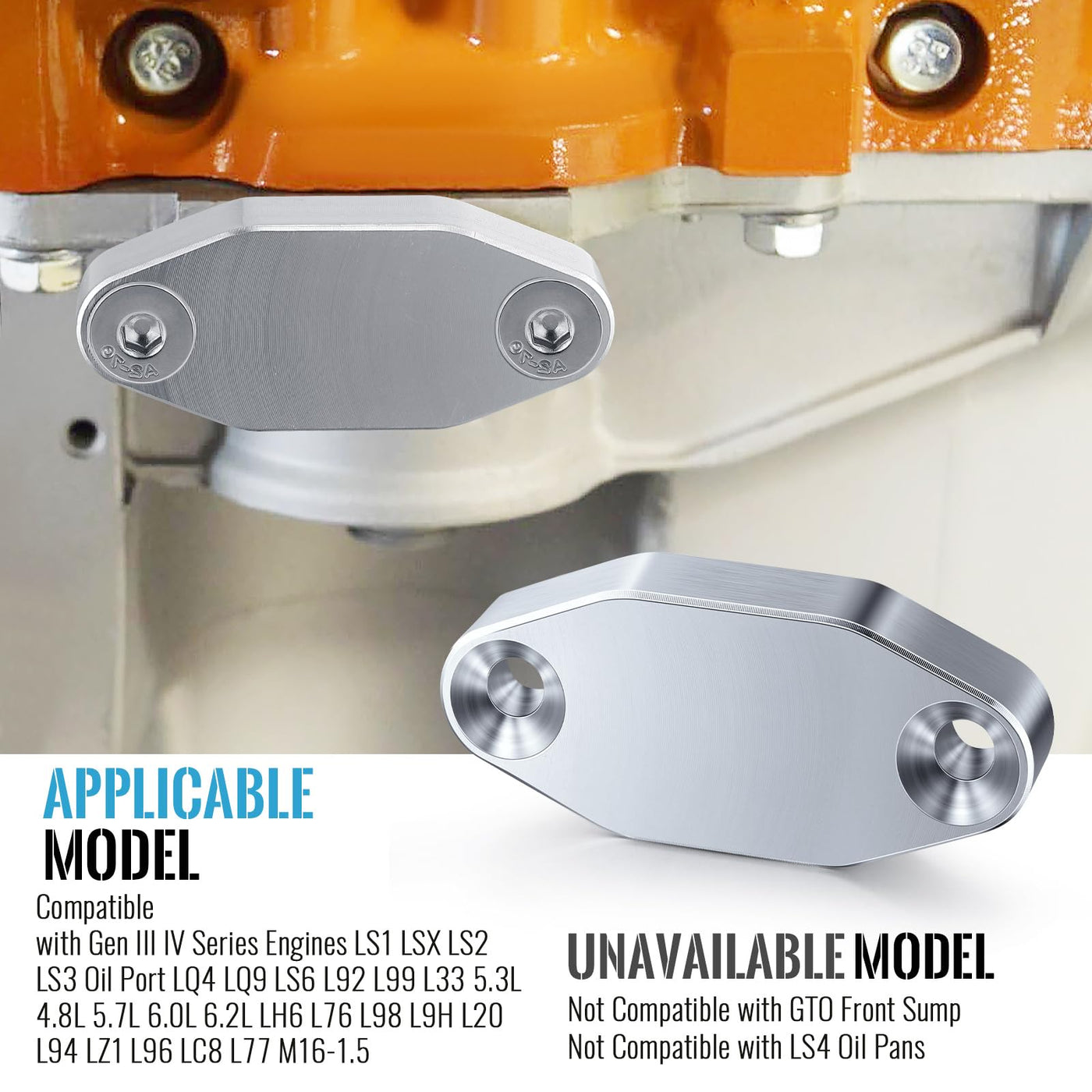 Features: Our Billet Oil Pressure Sensor Relocation Adapter Port is Compatible with Gen III IV Series Engines LS1 LSX LS2 LS3 Oil Port LQ4 LQ9 LS6 L92 L99 L33 5.3L 4.8L 5.7L 6.0L 6.2L LH6 L76 L98 L9H L20 L94 LZ1 L96 LC8 L77 M16-1.5 Specifications: Adapter Material: Aluminum Alloy Screw: M6x20 Flat Head 304 Material Dimensions: 2.68 x 1.06 x 0.47 Inch Color: Silver Package includes: 1 x LS oil cooler block off plate 2 x Screws 1 x O ring Notes: Please check compatible models before purchasing. Small parts included, please keep them away from little kids to avoid swallowing risk.