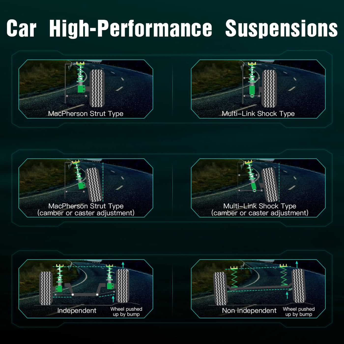 Q: How do the SCITOO Coilover Suspensions improve driving comfort?A: These Coilover Suspensions are designed to significantly enhance stability during bumps or cornering by effectively dampening driving vibrations. This results in improved ride comfort, especially under challenging road conditions and heavy loads.