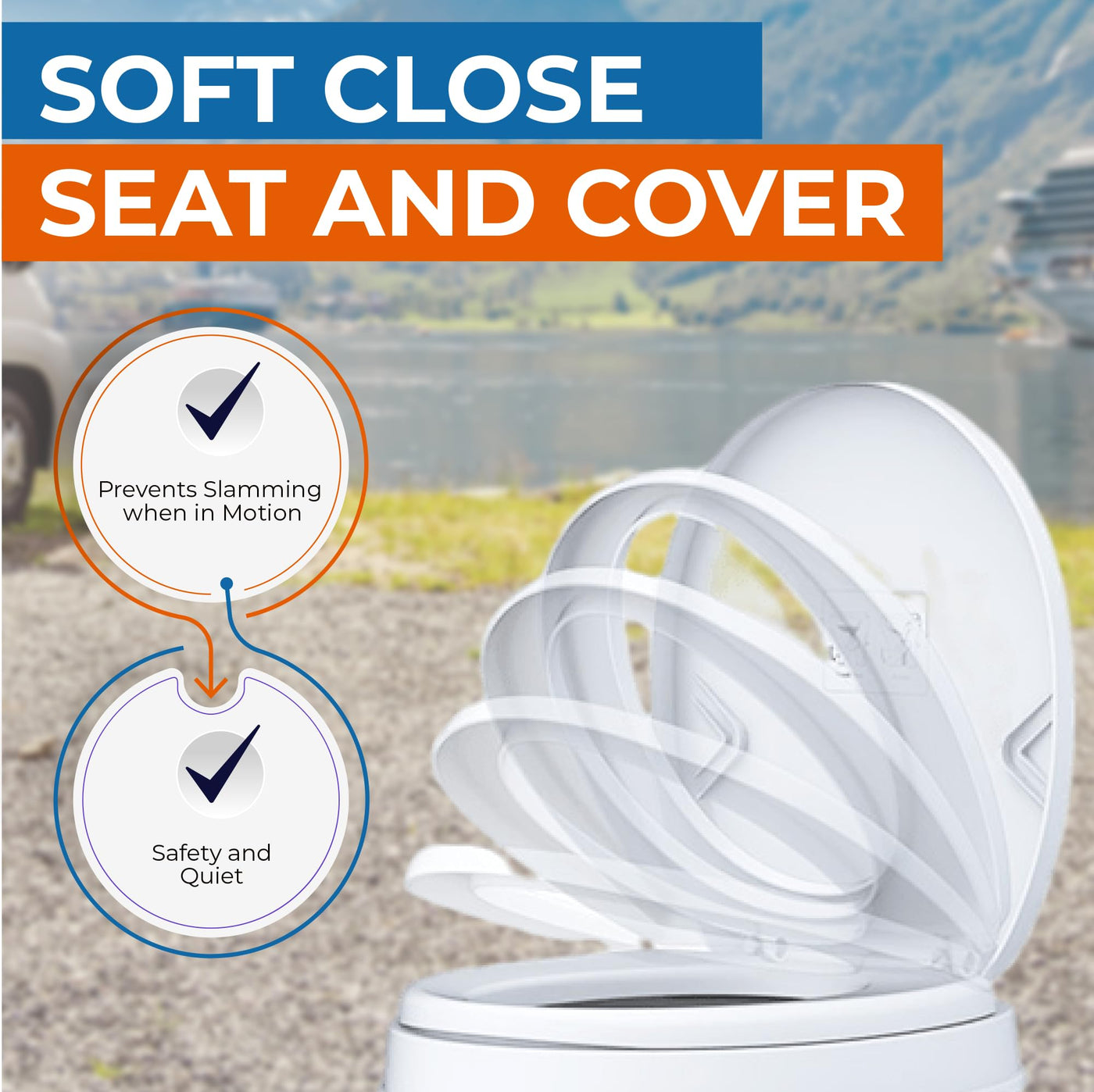 Q: Does the SEAFLO toilet come with a soft close seat?A: Yes, the SEAFLO Residential Height RV Toilet is equipped with a soft close seat and cover, which prevents slamming while in motion, enhancing safety and comfort during travel.