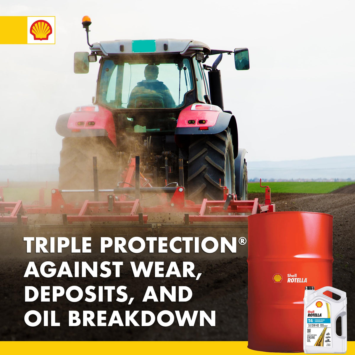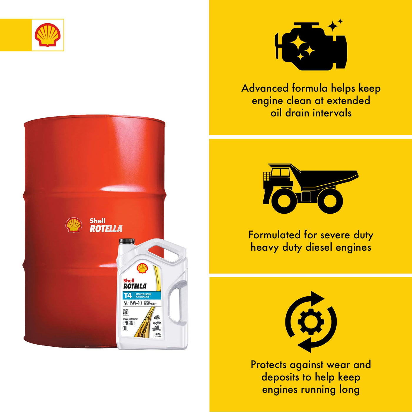 Shell Rotella T4 Triple Protection 15W-40 Diesel Engine Oil Provides Exceptional Wear Protection For Longer Life In A Wide Range Of Heavy-Duty Engines- From Diesel Pickup Trucks To Tractors To Tractor Trailers. It Uses Advanced Additive Technology For Superior Engine Cleanliness Throughout The Oil Drain Interval To Protect Under The Most Severe Engine Conditions Found In Modern, Low-Emission Engines And Older Hard-Working Diesel Engines. Shell Rotella T4 15W-40 Engine Oil Provides Deposit Control That Helps Keep Engines Clean For Optimum Performance And Long Life. It Effectively Sustains Emissions Control System Durability Where Diesel Particulate Filters And After-Treatment Systems Are Used. Plus, It Provides Enhanced Protection Against Viscosity Loss Due To Shear And Improved Oil Aeration Compared To The Previous Formulation. Shell Rotella T4 Triple Protection 15W-40 Is An Excellent Choice For On-Highway Fleets, General Haul, Construction, Agriculture, Public-Transport Operators, Diesel Pickup Trucks, Including High-Power Vehicles Where Resistance To Increased Heat And Stress Is Required. Meets Or Exceeds The Following Industry Requirements: Api Ck-4, Cj-4, Ci-4 Plus, Ci-4, Ch-4; Acea E9; Allison Tes-439; Jaso Dh-2, Ma, Ma2. Exceeds The Requirements Of The Following Oem Specifications: Caterpillar Ecf-2, Ecf-3; Cummins Ces 20086, 20081; Detroit Fluids Specification (Dfs) 93K222, 93K218; Deutz Dqc Iii-10 La; Ford Wss-M2C171-F1; Mack Eo-S 4.5, Eo-O Premium Plus; Man M3575; Mb-Approval 228.31; Mtu Category 2.1; Volvo Vds-4.5, Vds-4. For Technical Questions, Contact The Shell Technical Help Desk.
