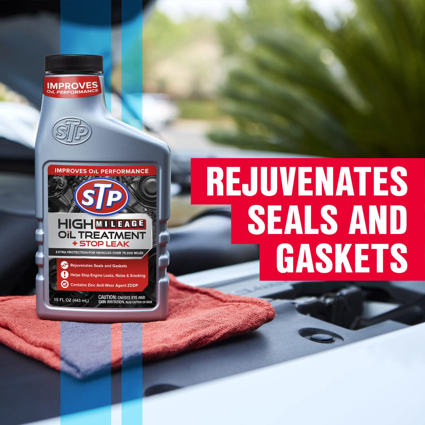 Q: What is STP High Mileage Oil Treatment + Stop Leak used for?A: STP High Mileage Oil Treatment + Stop Leak is designed to protect the engines of high-mileage vehicles, specifically those with over 75,000 miles. It helps to reduce metal-to-metal friction, rejuvenate seals and gaskets, and stop leaks, noise, and smoking.